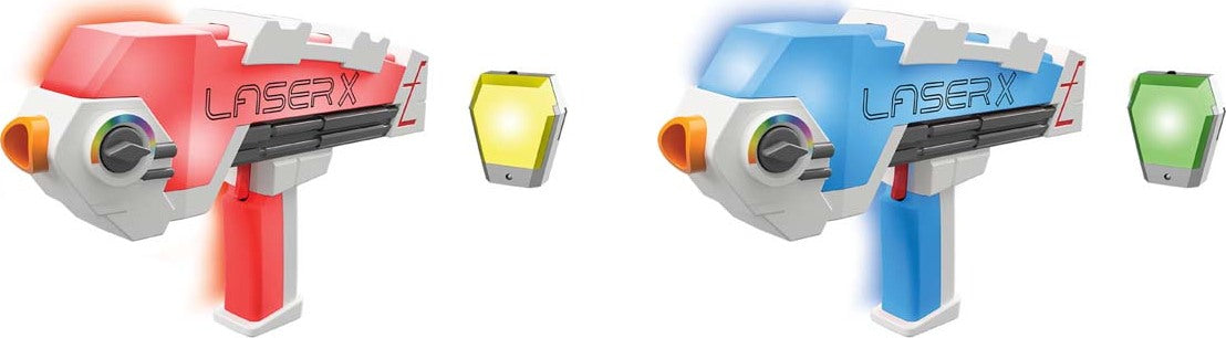 This laser game set takes things to a whole new level with rainbow colors and a 300-foot shooting distance. Includes 2 Laser X Evolution Sport blasters and 2 arm receiver markers. Each Laser X Evolution Sport blaster gun has an interactive voice coach and full-color lighting effects to keep track of shots. Can be set for team or individual play mode. The Blast Power Indicator lets players know how many blasts remain. The Laser X Evolution Sport blaster guns also feature a unique turning dial that lets players choose from 20 different team colors.