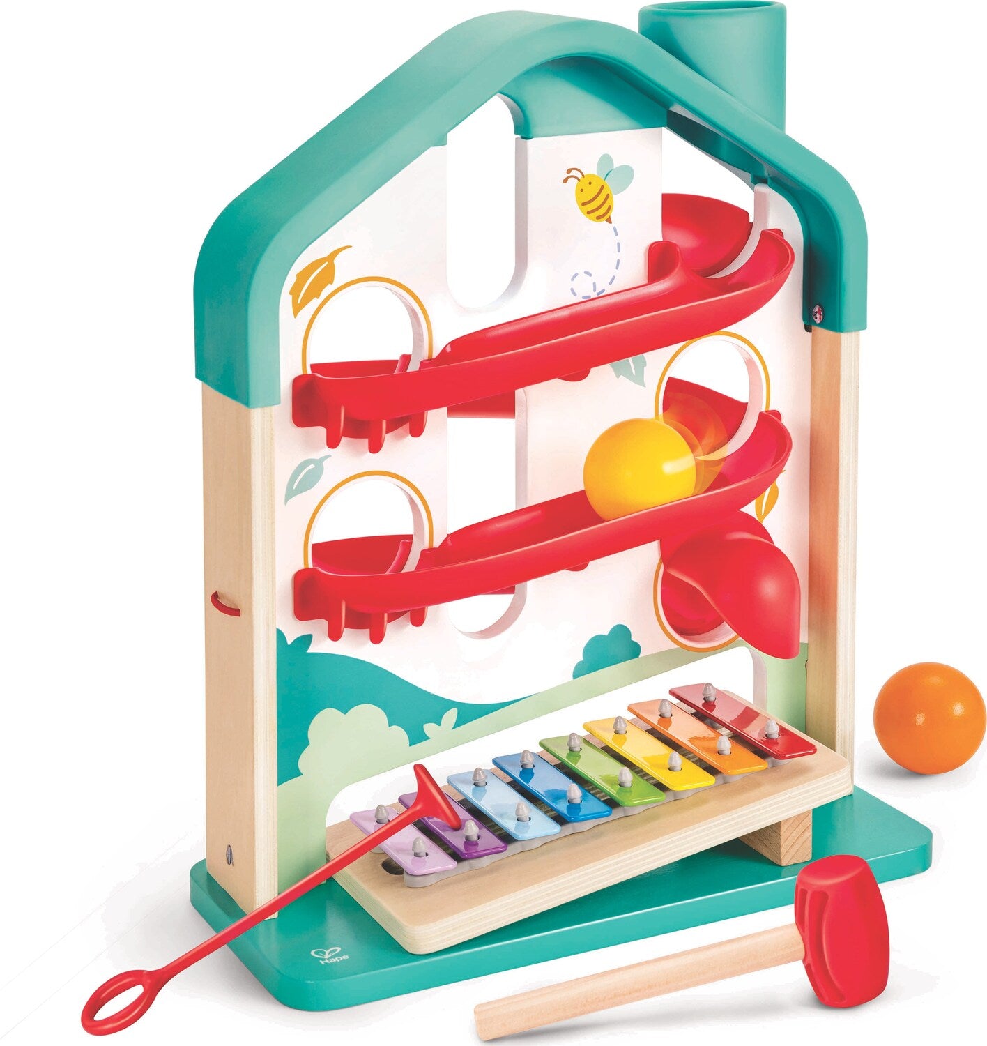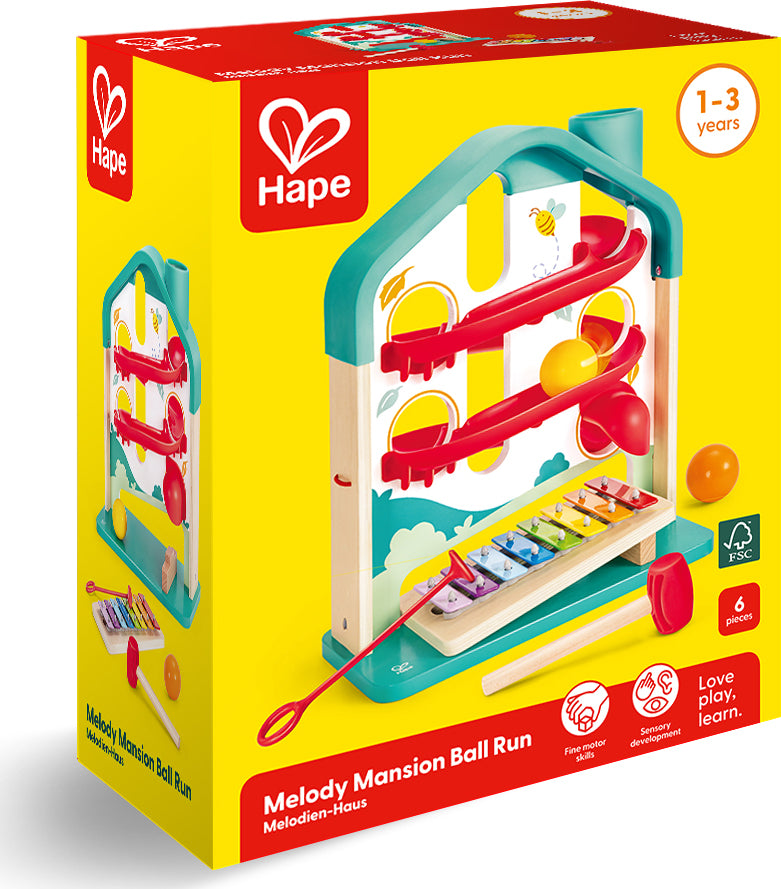 Experience the joy of music and rolling fun with Hape's House-shaped Ball Rolling Game. Navigate the Colorful maze, or take out the xylophone board for individual melodic play.