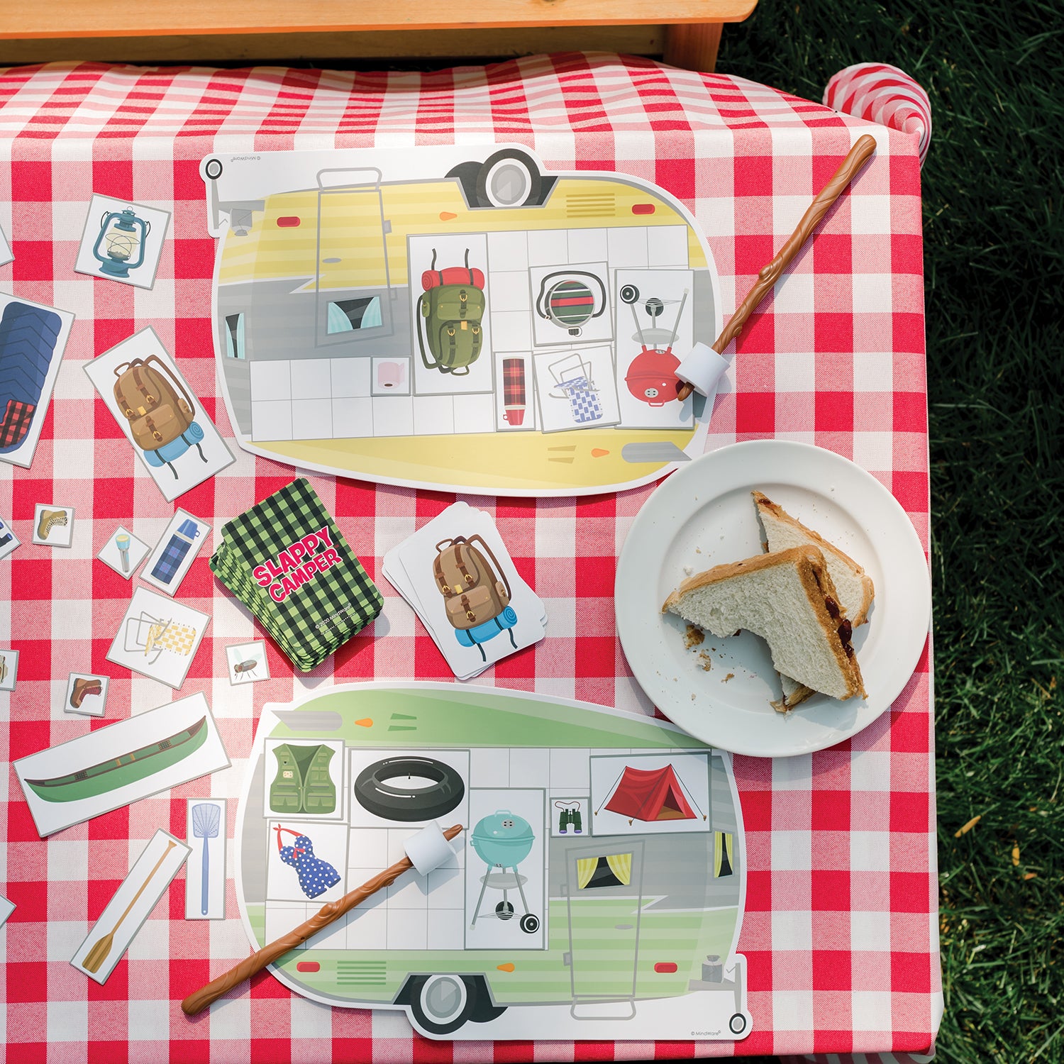 Includes 4 camper game boards, 4 marshmallow slapper sticks, 47 camping gear pieces, 94 camping gear cards and instructions