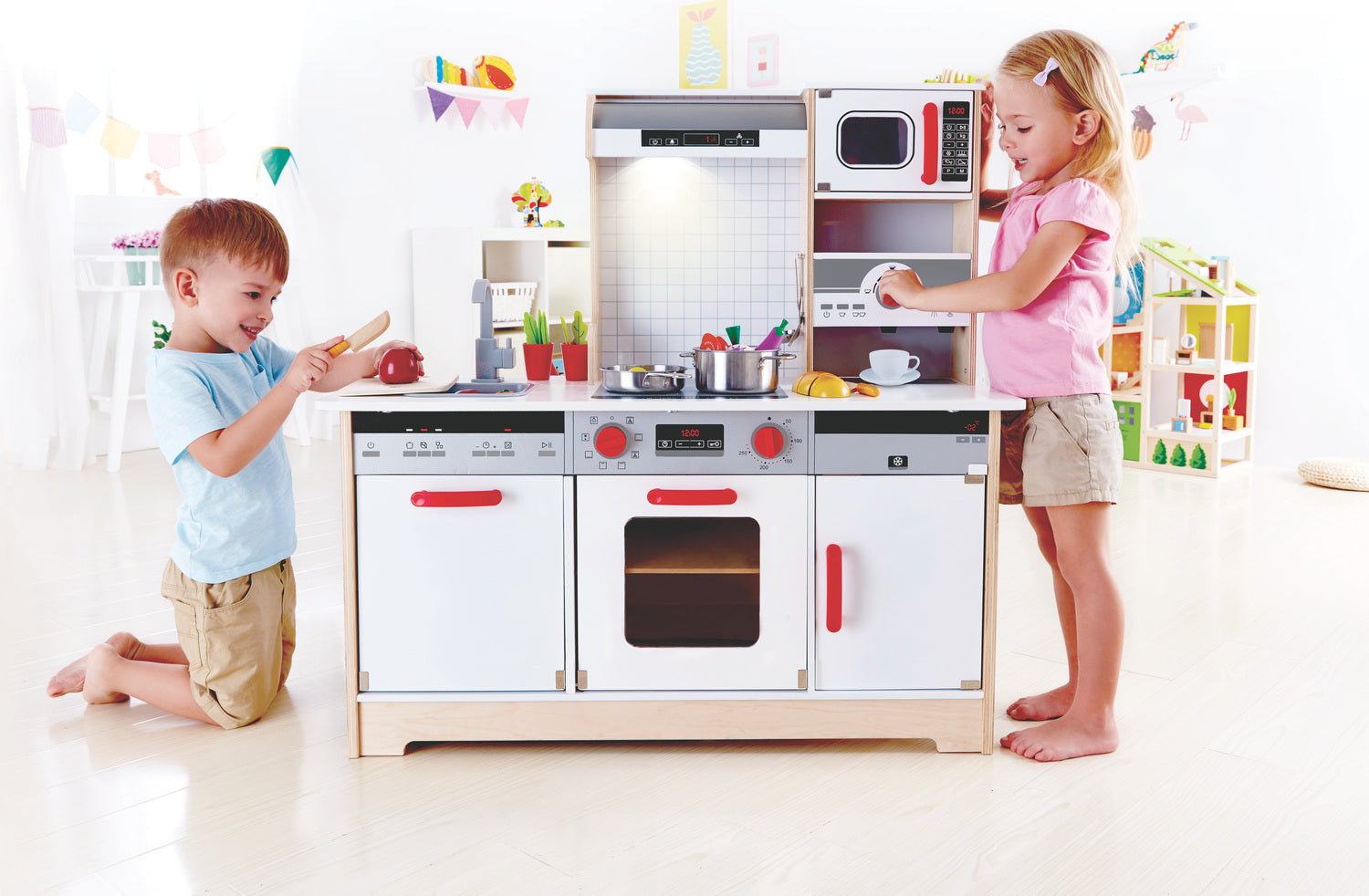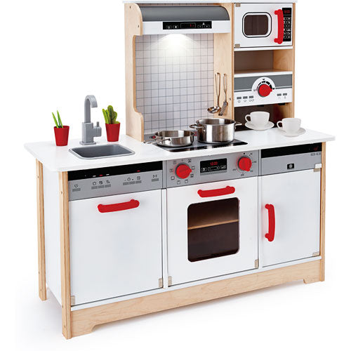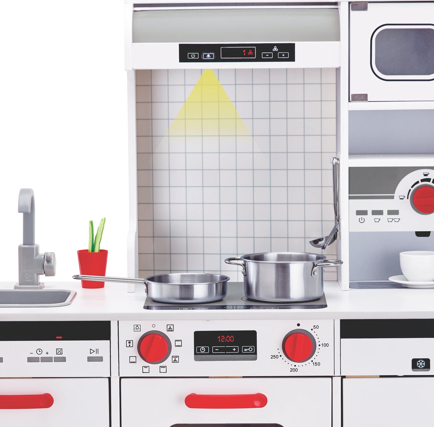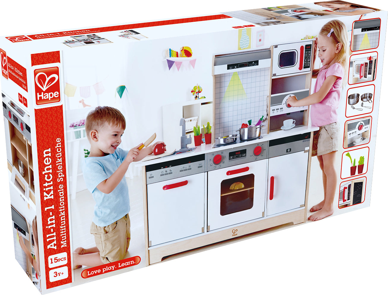Children will love this multi-functional, All-in-1-Kitchen and its array of charming appliances and features, including a controllable range hood lamp and authentic microwave "ding".