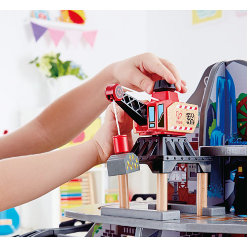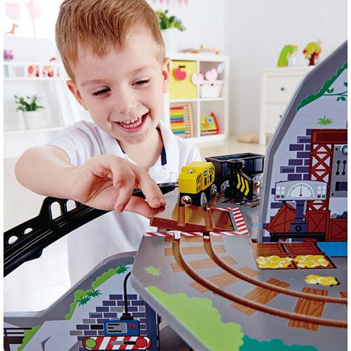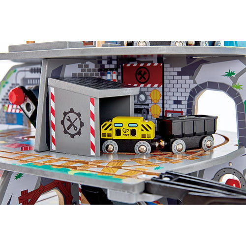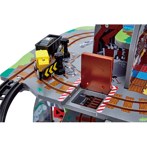 Drive your train from the surface of a mighty mountain into the busy mine operating deep inside! This multi-level play-set provides the ultimate wooden-railway experience and includes a waterfall tunnel, an obstacle bridge, a crane, a conveyor belt and a repair station!