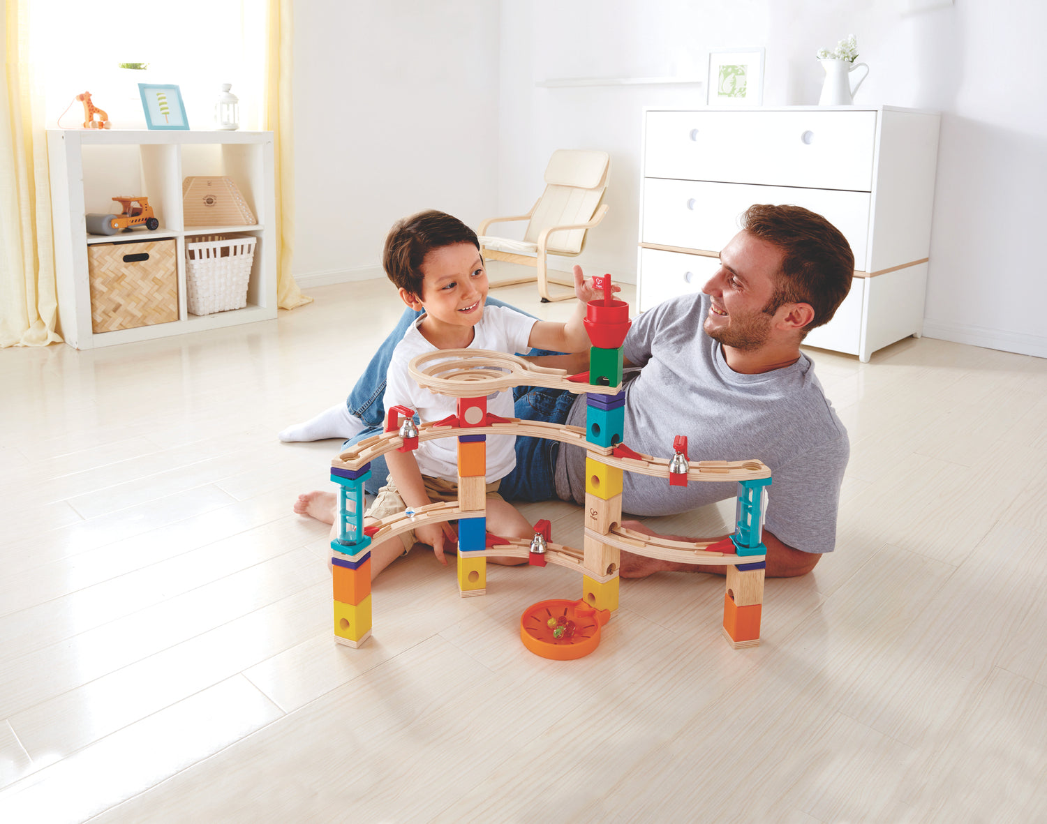 Escape from the rotary tower with this exciting Quadrilla set featuring two transparent vertical stairways. Watch as the marbles trip their way down each stairway and shoot out onto the rail. To celebrate their escape, they will ring the three hanging bells. Brings new dimensions of sight and sound to your marble runs. Helps to develop spatial thinking and an understanding of Science, Technology, Engineering and Mathematics (STEM) principles. Praised by the Wall Street Journal as the perfect toy for teaching children how to code. Compatible with all Hape Quadrilla sets. For ages four and over.