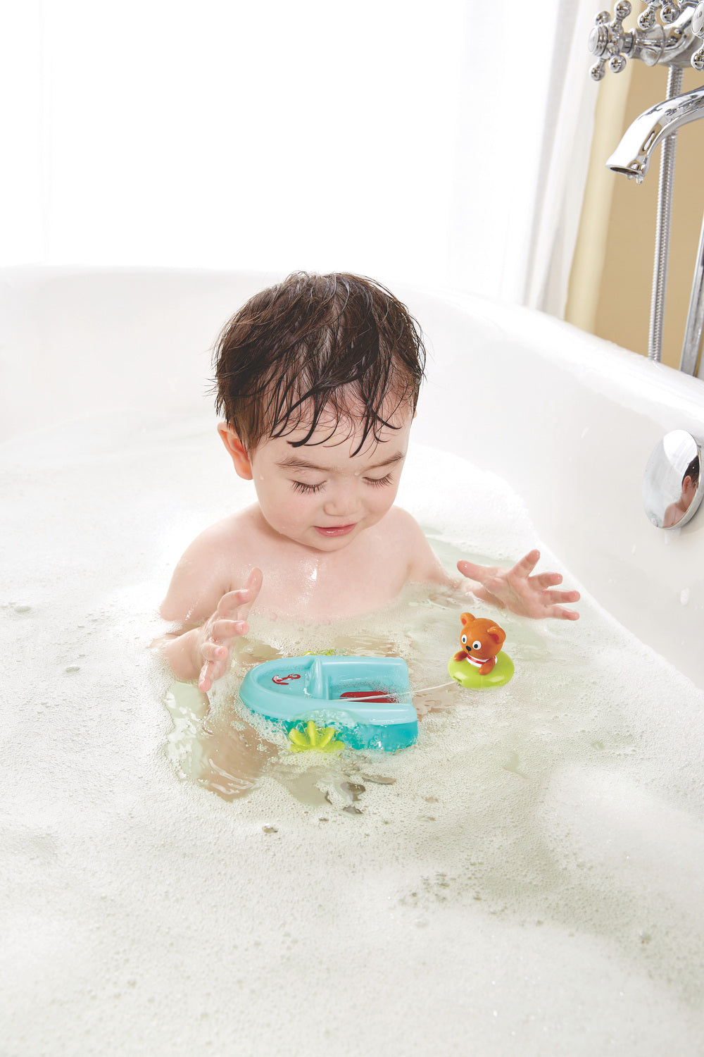Make bathtime fun with this splendid speedboat, complete with a tubing bear! Pull the back on his string and the boat will actually move through the water, pulling the bear behind on a tube until he reaches the boat safely