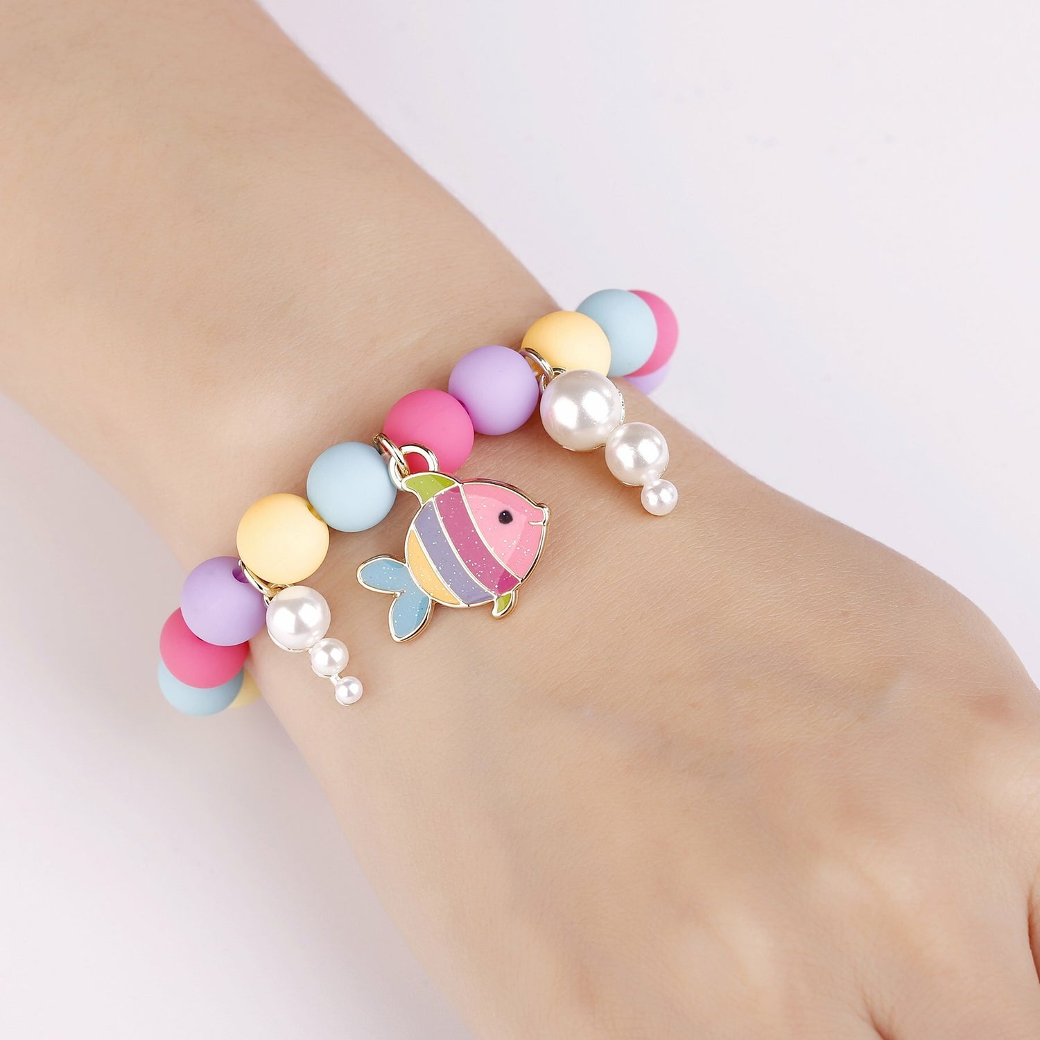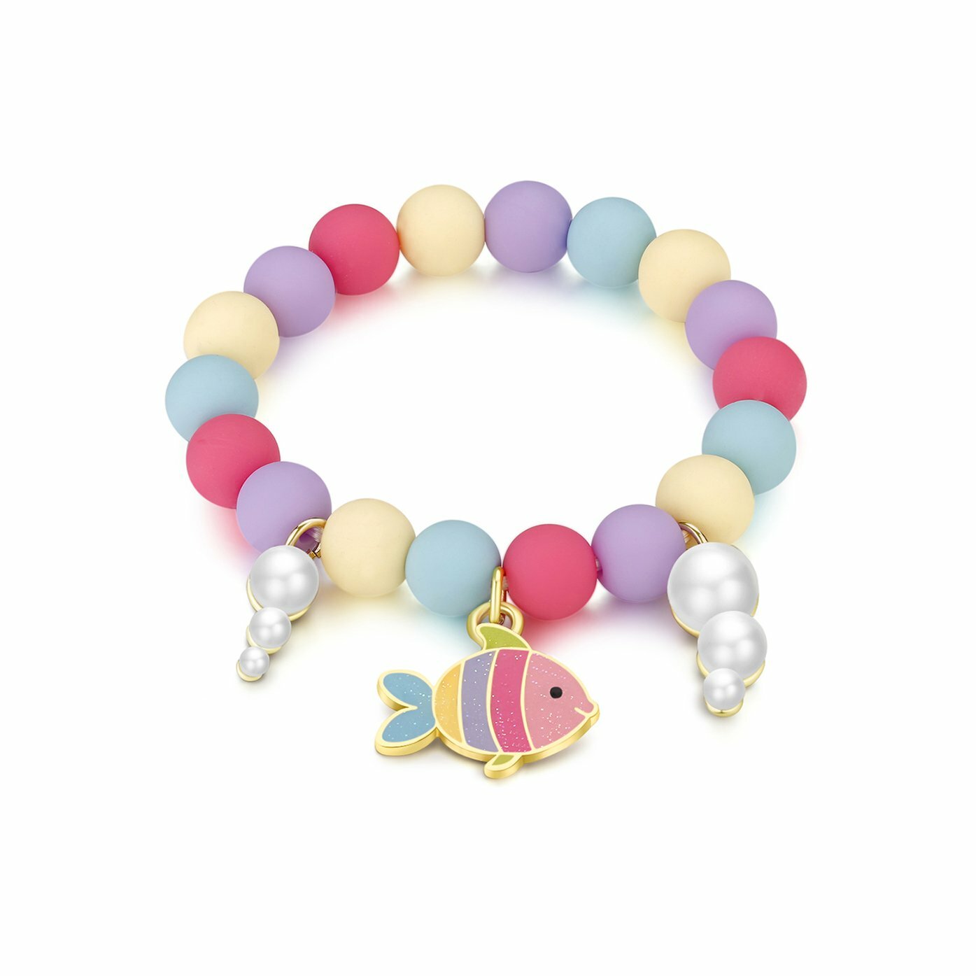 The Rainbow Fish Bracelet is oh so trendy and features colorful beads, a beautiful rainbow fish charm, and under the sea bubble charms. Pair with matching Cutie Studs/Clip-Ons to complete the look or Mix & Match designs to show off all her favs.