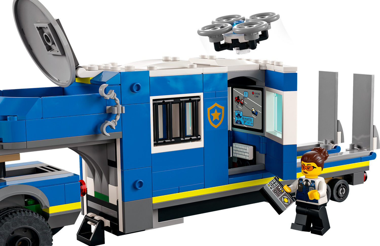 - What's in the box? – Everything kids need to build a toy police pickup, trailer with jail, drone, ATV, and a tractor with trailer, plus 4 minifigures, including 3 LEGO® City TV characters