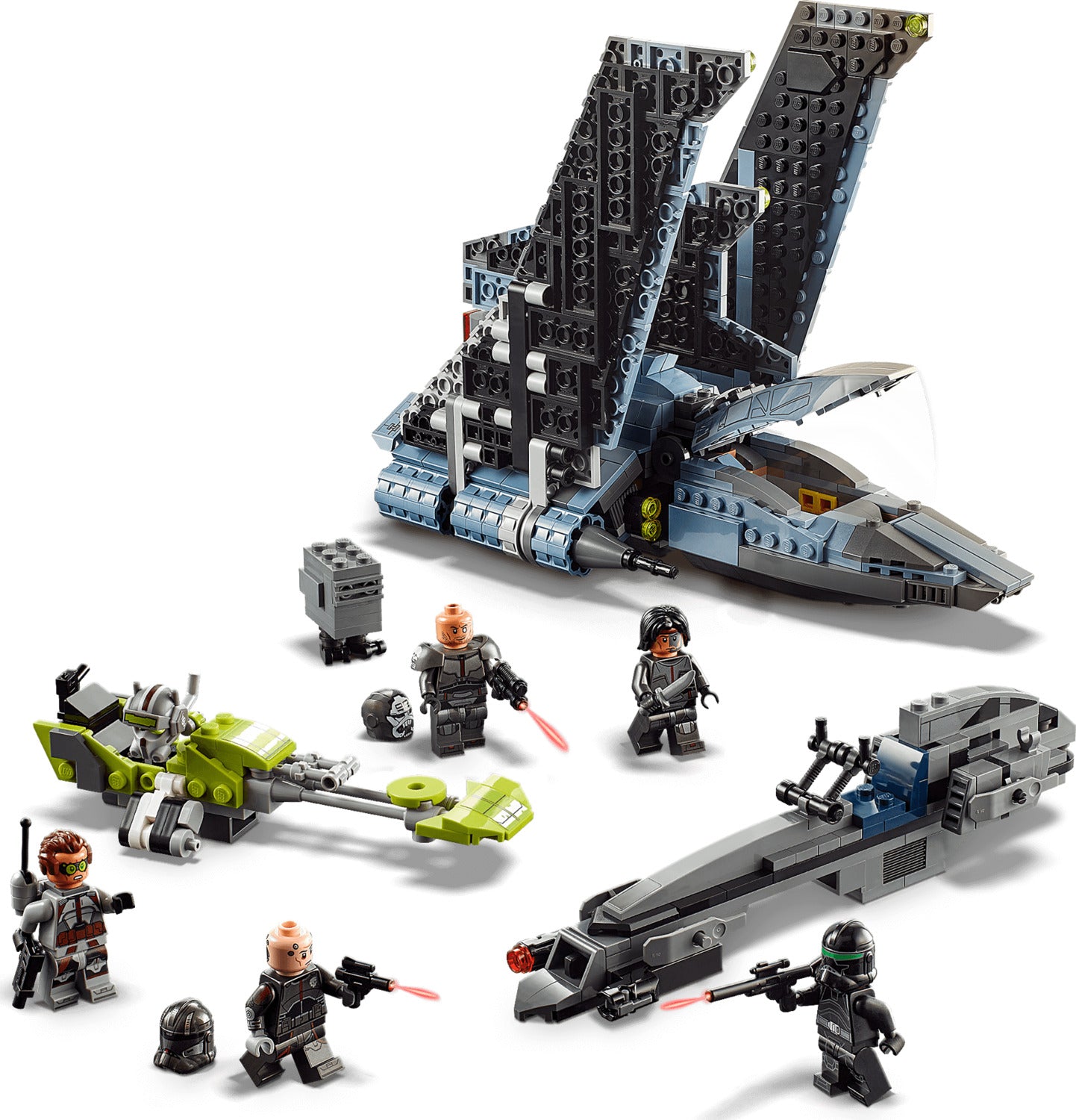 The set has 5 new-for-August-2021 LEGO minifigures of Bad Batch clones Tech, Echo, Hunter, Wrecker and Crosshair, a Gonk Droid LEGO figure, plus cool weapons and 2 buildable speeders to inspire imaginative play. Step-by-step instructions are included to ease the construction process.