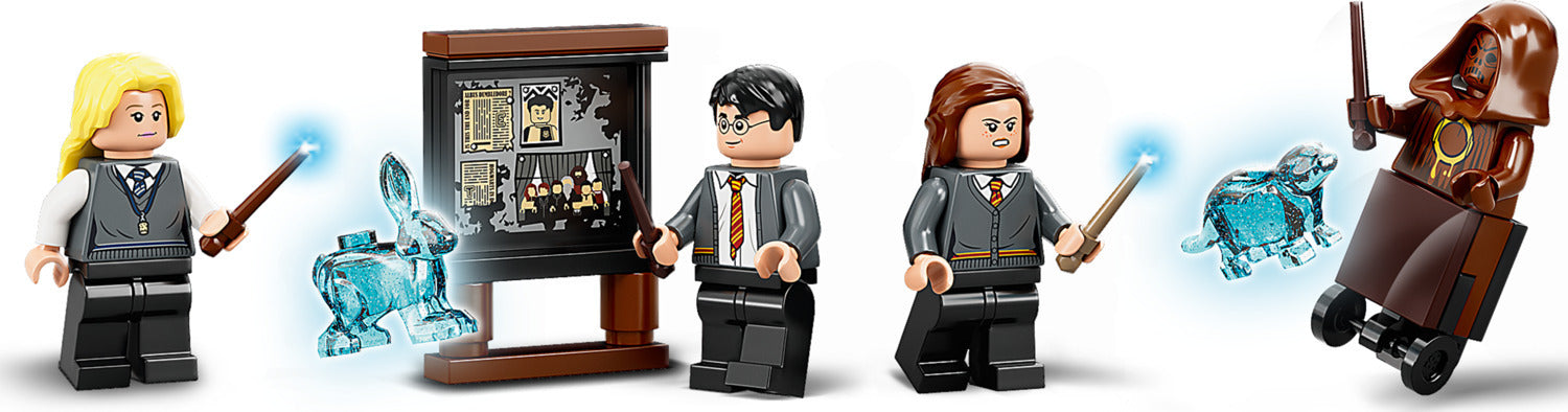 - Includes 3 minifigures with wands – Harry Potter™, Hermione Granger™, Luna Lovegood™ – 2 animal Patronuses, power shooter, dummy Death Eater and a detailed room with a pillar, board and fireplace.