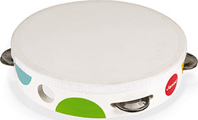 CONFETTI TAMBOURINES with cymbals. Red, yellow, green, orange... Confetti, a complete line of musical instruments featuring Pop N' Rock designs ! Confetti awakens all of the senses and introduces the youngest musicians to the joys of musical improvisation. Toy made of wood (plywood) and metal. Printing: standard painting and silk-screen.