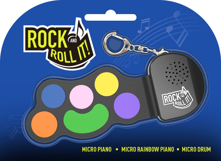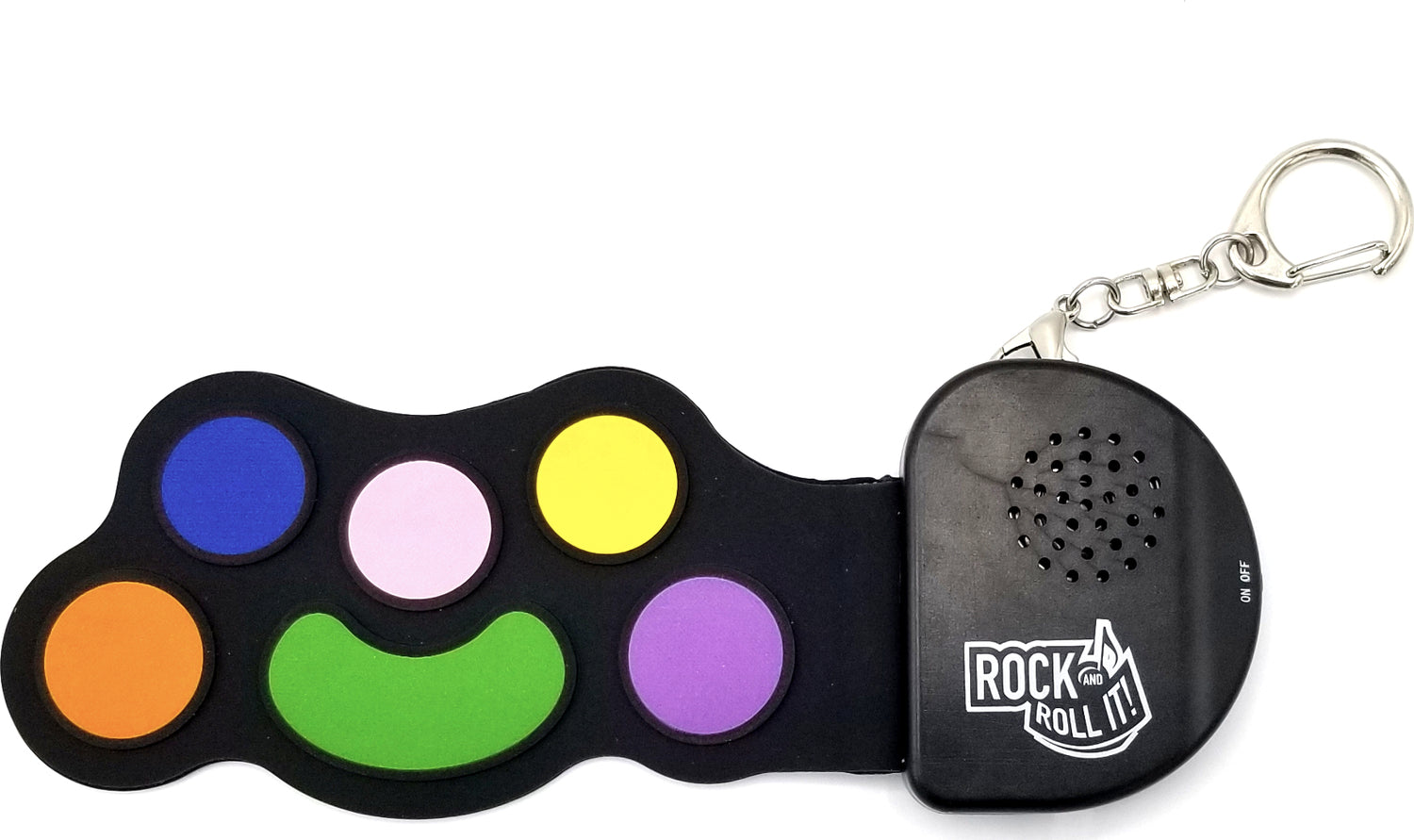 Color-coded drums for some serious rhythms. Don't be fooled by the size! Soft, silicone rubber with a keychain for bands on the run. Six different sounds makes this drum set a truly fun one. Battery included.