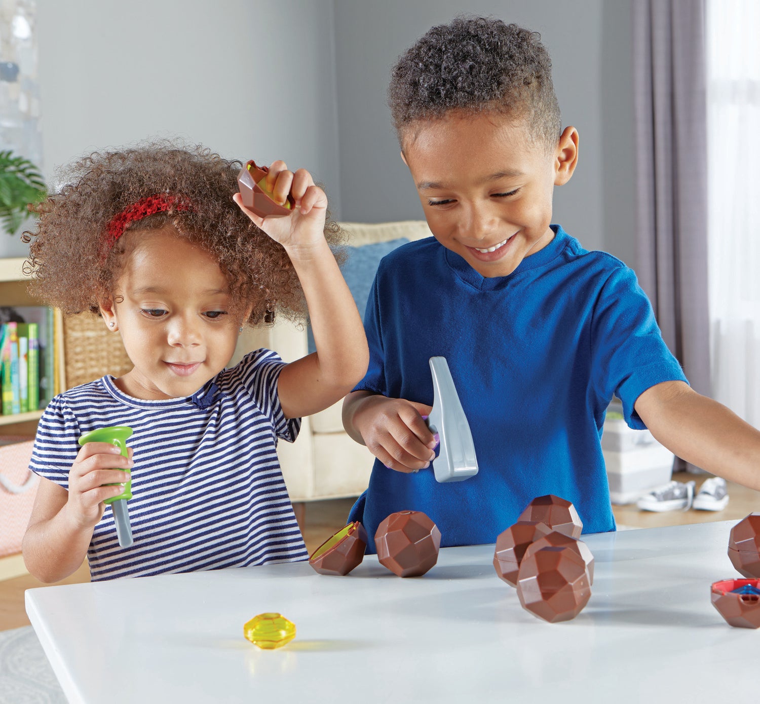 Crack open a colorful gem surprise! Little ones get a no-mess introduction to sorting, matching, and counting with the play geodes and gems of Rock 'n' Gem Surprise from Learning Resources. Using the included play hammer and chisel, kids can crack open each reusable play geode and discover the translucent plastic gemstones inside. Gems double as manipulatives, and come in eight different colors and four different shapes - you might find a red heart, a purple triangle, a green diamond, or more fun combinations. In addition to helping kids learn early sorting, matching, and counting skills, Rock 'n' Gem Surprise also introduces kids to early STEM and geology concepts without the messy clean-up associated with real rocks and geodes. Each of the set's two-piece play geodes pops apart and snaps back together for endless learning fun - crack 'em open again and again! Rock 'n' Gem Surprise also comes with a storage bag for fast and simple clean-up.