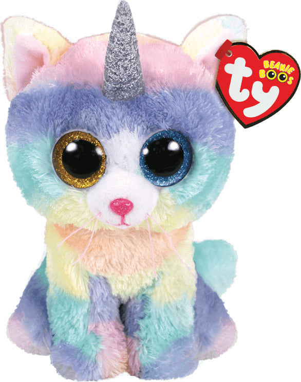 Calico cats don’t look like me, I’m pastel and fluffy and very lovely. Now look on my head, what do you see It’s a horn made of silver, created especially for me. My eyes, they glitter, but only one is gold, when they made me, they really broke the mold. My name is Heather, I’m very unique. I’m the prettiest unicorn, you’ll ever meet. BIRTHDAY: April 26 POEM: I was a cat when I was born Then I magically grew a horn I know that this is not the norm But now I am a unicorn! Who doesn't want to be a cat AND a unicorn? Uni-cat! Purrfect for fans of both species! Plush cat body with pastel-colored, snuggly soft Ty Silk Big sparkly glitter Beanie Boo eyes Textured Super Sparkle accents on her stuffed unicorn horn Cheerful expression brightens your day Includes official Ty Heart with birthday and poem Surface clean only 6 in ( cm )