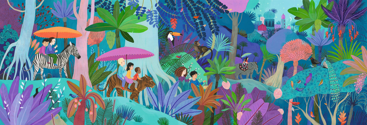 Beautiful, one of a kind art in a big, dramatic puzzle, finished it’s over 3 feet long and a foot tall; each comes with a full size poster of the art. Walk in this magical jungle, ride the zebra, tiger and elephant, discover all the hidden animals, 200 pc