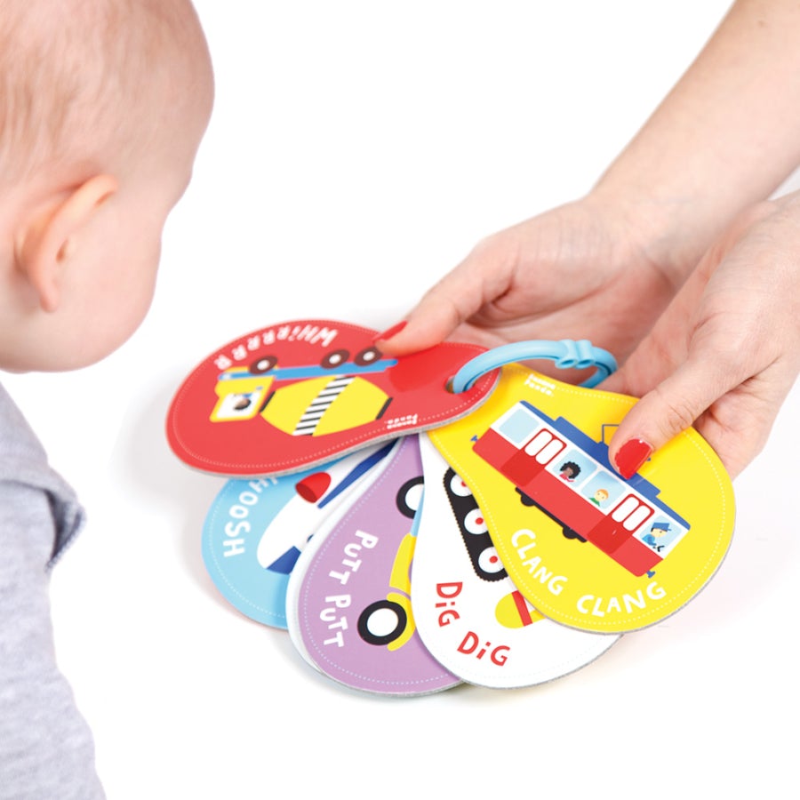 These double-sided flash cards prompt children to imitate the sounds they hear and encourage their first words. Each page features a simple, vibrant illustration and word describing a sound for imitation, which is the right stimulus for capturing a child’s attention at this stage of development. The sturdy pieces are bound together with a ring that can be removed for more convenient use.