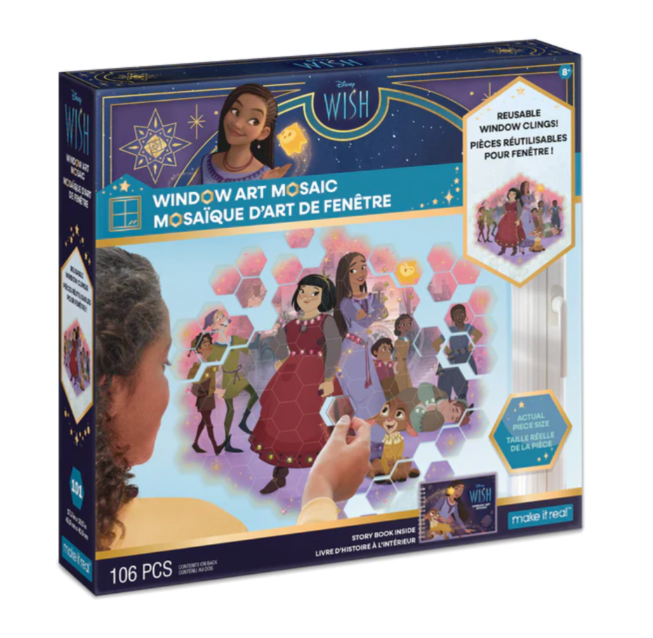 The fun of a puzzle and the result of a beautiful window decal! Start in the center of the puzzle, then challenge yourself to align the hexagons to create a fun Disney Wish mosaic! Each kit contains: precut vinyl cling pieces on printed paper backing, hexagon removal tool to make easy transitions when moving the location of a piece or pieces, a story book with pages to store the window clings, and simple instructions. When finished, admire as the sunshine illuminates the window art mosaic and brings a pop of color to the space. The window clings can also be place on windows mirrors, flat surface shower doors, and more!