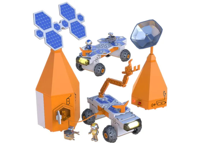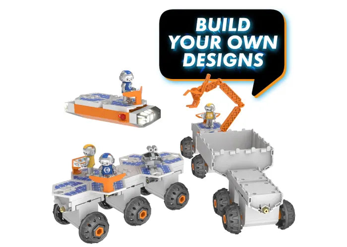 - Includes Communication Station with a rotating Radar Dish, Power Station with Rover Charger, Powered Space Rover with light-up headlights, Free Wheeling Space Rover with light-up headlights Light-Up Nose Cone, Rocket Nozzles, Space Rover with light-up headlights, 2 astronaut and 2 robot figures, and sticker sheet for customization