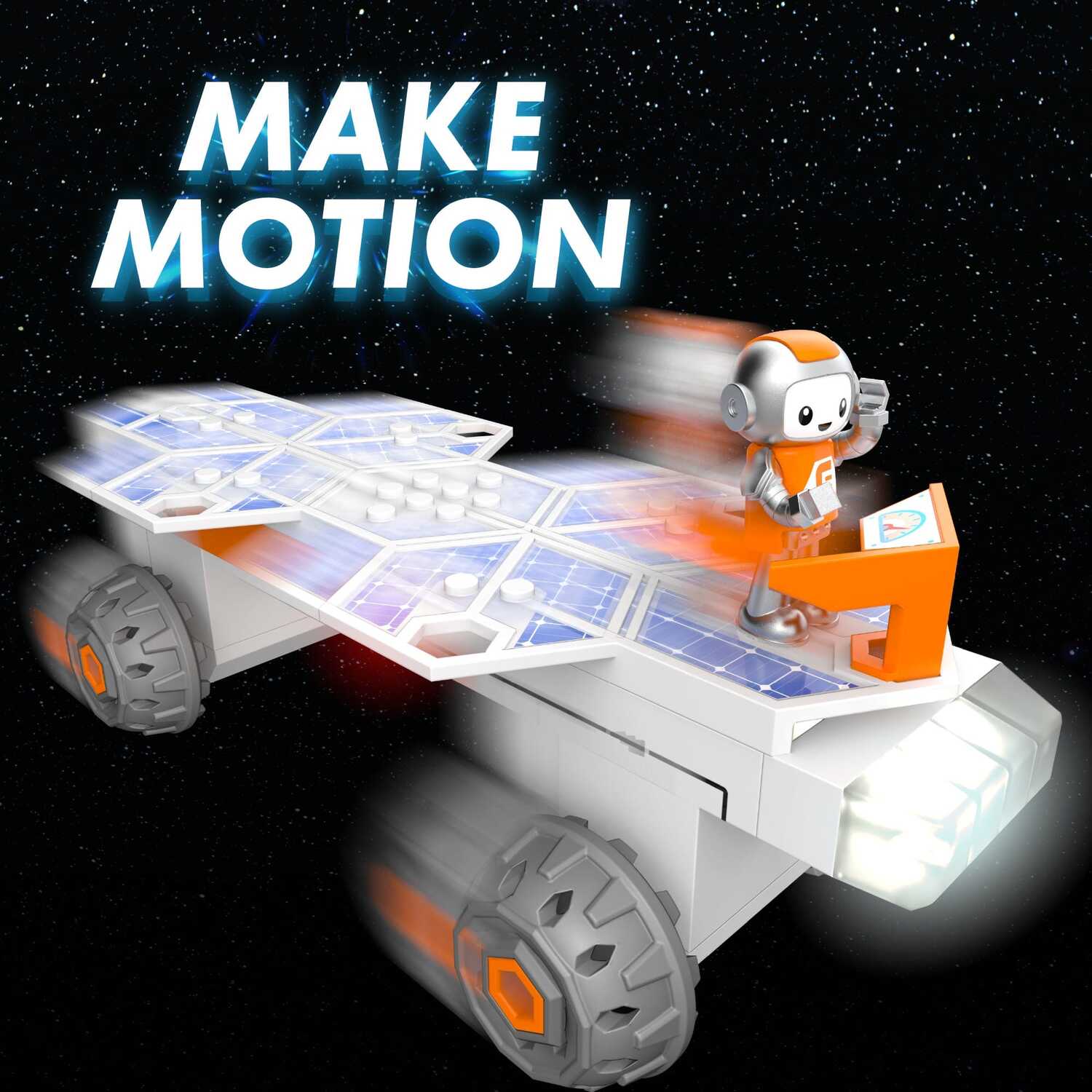Line up the circuitry graphics on the oversized pieces and snap them together to build a fully powered, large-scale, space-themed world. Follow the easy instructions to build a Communication Station with a rotating Radar Dish, Power Station, Rover Charger, Space Rover with Motor, non-powered Space Rover both with wheels and light-up headlights. Or connect the pieces your way to make your own, out-of-this-world, custom builds!