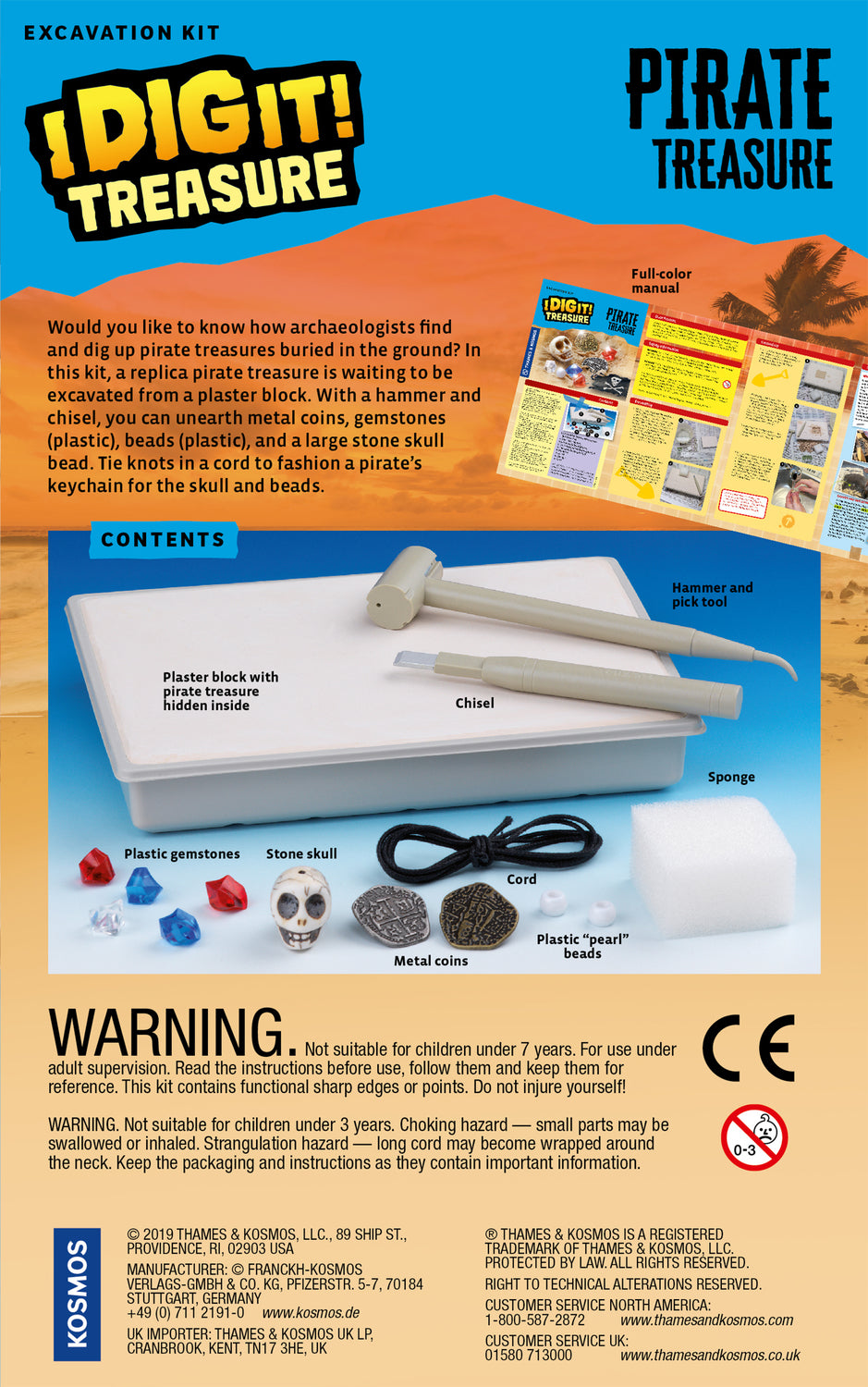 All hands on deck - there''s treasure to be found! In this pirate-themed dig-out kit, a replica pirate treasure is waiting to be excavated from a plaster block. With a hammer and chisel, you can unearth metal coins, gemstones (plastic), beads (plastic), and a large skull bead, all while learning how real archaeologists find and dig up pirate treasures buried in the ground. Learn how to tie a reef knot to fashion a pirate''s keychain for the skull and beads!
