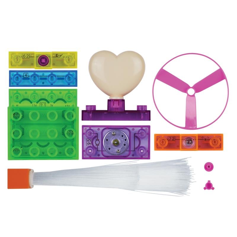 This kit provides hours of fun and educational play for kids 8 and up. The colorful building blocks have electronic components in them that, when assembled properly, will make circuits that light different LEDs and a fi ber optic tree