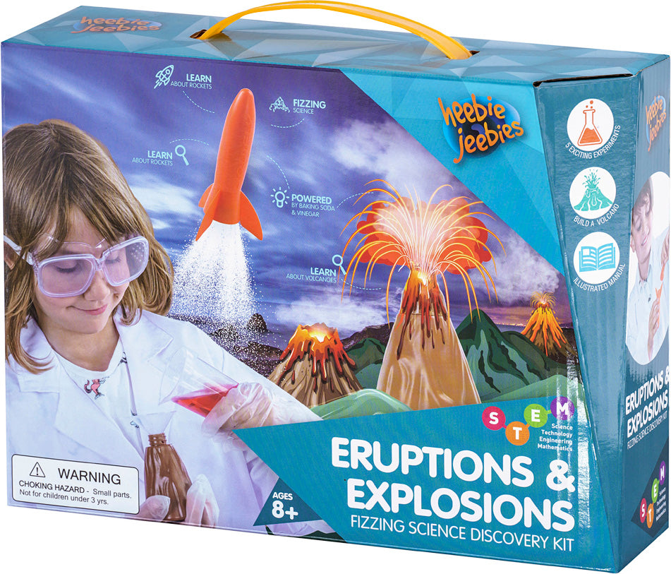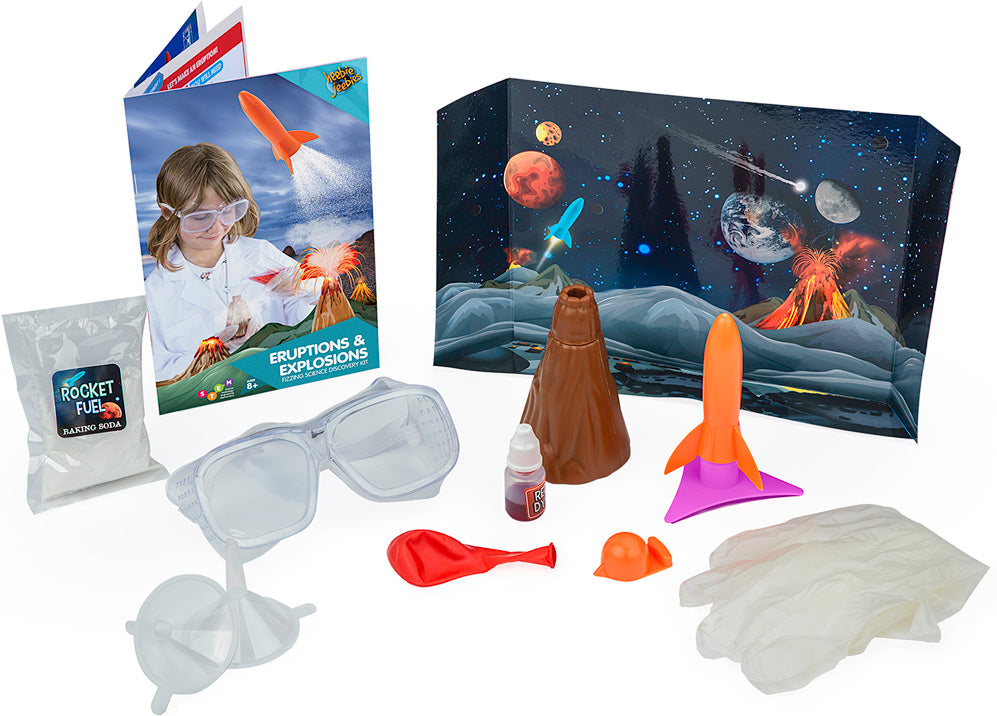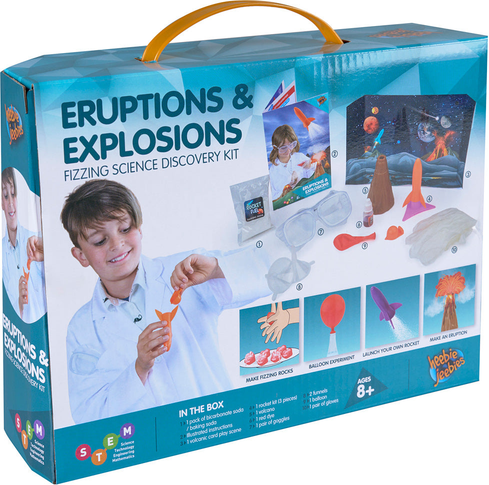 The Eruptions and Explosions kit is perfect for any budding scientist that loves to get hands on and watch experiments bubble and fizz. Complete 5 experiments, including launching a rocket, making a volcano, and inflating a balloon without blowing a" all using the reaction of bicarbonate and vinegar. After you've done each experiment, you can learn about how volcanoes, rockets and natural forces work with an educational booklet inside. This is the perfect fun STEM learning tool for both girls and boys. The kit comes with a model volcano, rocket, chemicals, and equipment including protective goggles and gloves.