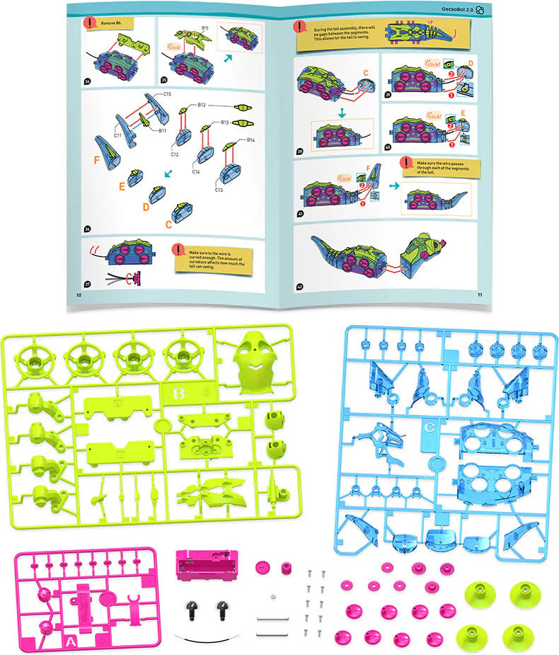 Going up! Build an adorable robotic gecko that defies gravity to crawl up, down, and all around smooth vertical surfaces! As you assemble this motorized, multi-legged machine with suction cup feet and an innovative gear system, you’ll learn about its inner mechanisms including an electric circuit complete with motor, battery, and switch. Then experiment to see which types of surfaces your Geckobot can climb best and read about how suction cups work and how this robot climbs.