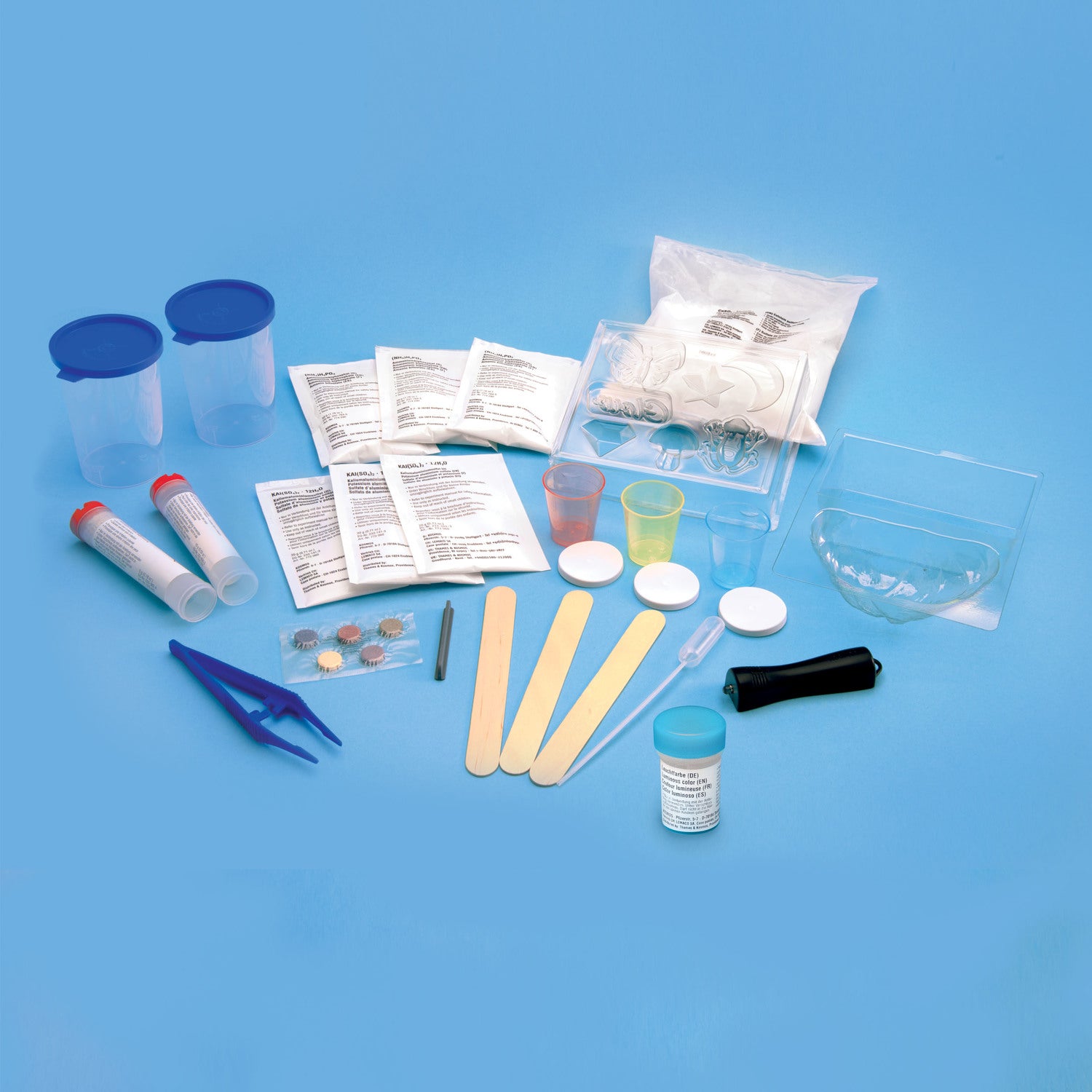 Grow dozens of colorful crystals, including two types of crystals that glow in the dark. Experiment with growing a variety of crystals from a potassium alum salt solution. Add strontium aluminate to your crystal solutions to make phosphorescent crystals that charge up in the light and then glow in the dark on their own, slowly emitting the stored light energy. Or try adding one of two ultraviolet-reactive pigments, pink and greenish-yellow, to your crystals to create fluorescent crystals, which glow in stunning colors under the light from the included ultraviolet flashlight. Mold fun plaster shapes, including moons, stars, butterflies, neon signs, mushrooms, frogs, and gemstones, and then grow layers of crystals on them. Use dye tablets together with the glowing pigments to experiment with different color combinations, and mix the dyes to grow a rainbow of custom colored crystals. Mold your own glowing crystal geode - a hollow rock lined with crystals - and create a beautiful crystal cavern inside. Experiment with growing crystals rapidly and slowly, and observe how that affects the crystal structures. See if you can grow one giant crystal, and many small crystals on the surface of a rock. Measure how the crystallization of solids out of a solution, and the dissolution of crystals back into solution, affect the temperature of the solution. Learn about the energy of crystallization. Investigate solutions, crystallization, and the chemistry of crystal growing. Learn about the structures and geometries of different crystal shapes. This kit is thoroughly tested and nontoxic. A full-color, 32-page experiment manual guides your experiments in the chemistry of crystals and glowing phenomena.