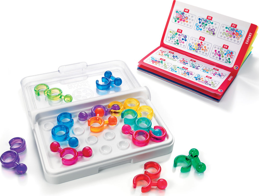 Multiple levels of brainteasing fun! SmartGames IQ Link features 120 challenges that build planning and problem-solving skills. Simple to play, but challenging to solve! Can you fit all 12 candy-colored pieces on the board? IQ Link comes in a self-contained, compact, and completely portable case. You can easily take your SmartGames travel games with you and not worry about losing pieces. Just close the container and toss it in your bag!