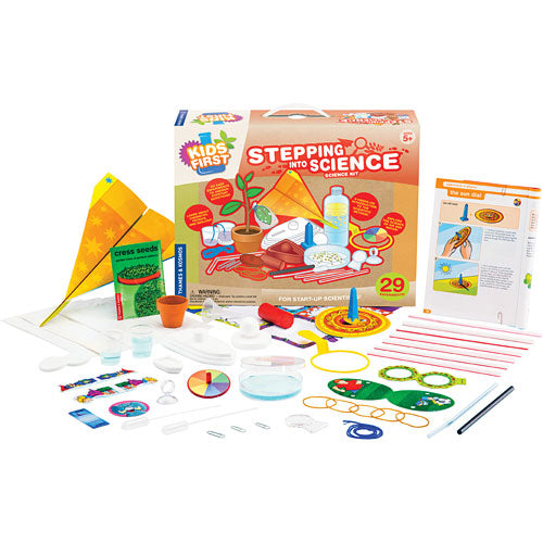 Begin a lifetime of scientific investigation and understanding with 29 fun experiments in five key areas: nature, physics, chemistry, air, and water. Learn what plants need in order to grow, observe the clouds, see how water climbs, watch plants sweat, and investigate plant propagation. Discover how a magnifying glass enlarges, how colors mix, how static electricity attracts, how sundials tell time, and how a motion picture works. Investigate air pressure, air flow, hovercraft, paper airplanes, and suction. Write secret messages, float a paper clip, blow super bubbles, observe capillary action, and test displacement. Build a soap-driven boat, mix oil and water, experiment with evaporation, paint with sugar, and watch colors separate. With a 48-page illustrated guidebook, Stepping into Science teaches science fundamentals with step-by-step, hands-on experiments, while also introducing children to the scientific method itself.