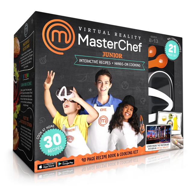 Step inside the MasterChef kitchen in virtual reality and learn everything from culinary skills, plating techniques, flavor pairing, and even food science for former contestants and winners of the hit FOX TV show! This interactive cooking kit for kids covers 30 delicious recipes, and even tackles sauces, dressings and knife skills as we take on STEM with the science behind food! This 21 piece set also includes full size kitchen utensils along with a MasterChef branded apron!