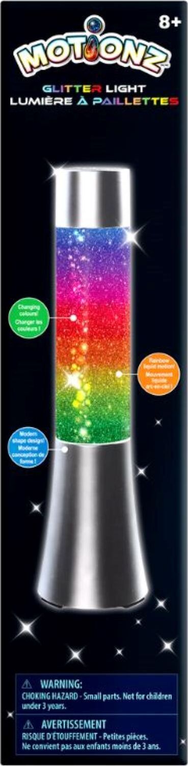 Add a splash of magic to any space with the Motionz Glitter Light! This 13" lamp transforms any room with its captivating color-changing design filled with sparkling glitter. Powered by USB or 3 AAA batteries (not included), it comes with a 1m USB cable for convenience. Ideal for ages 8 and up, it promises endless hours of glittery fun!