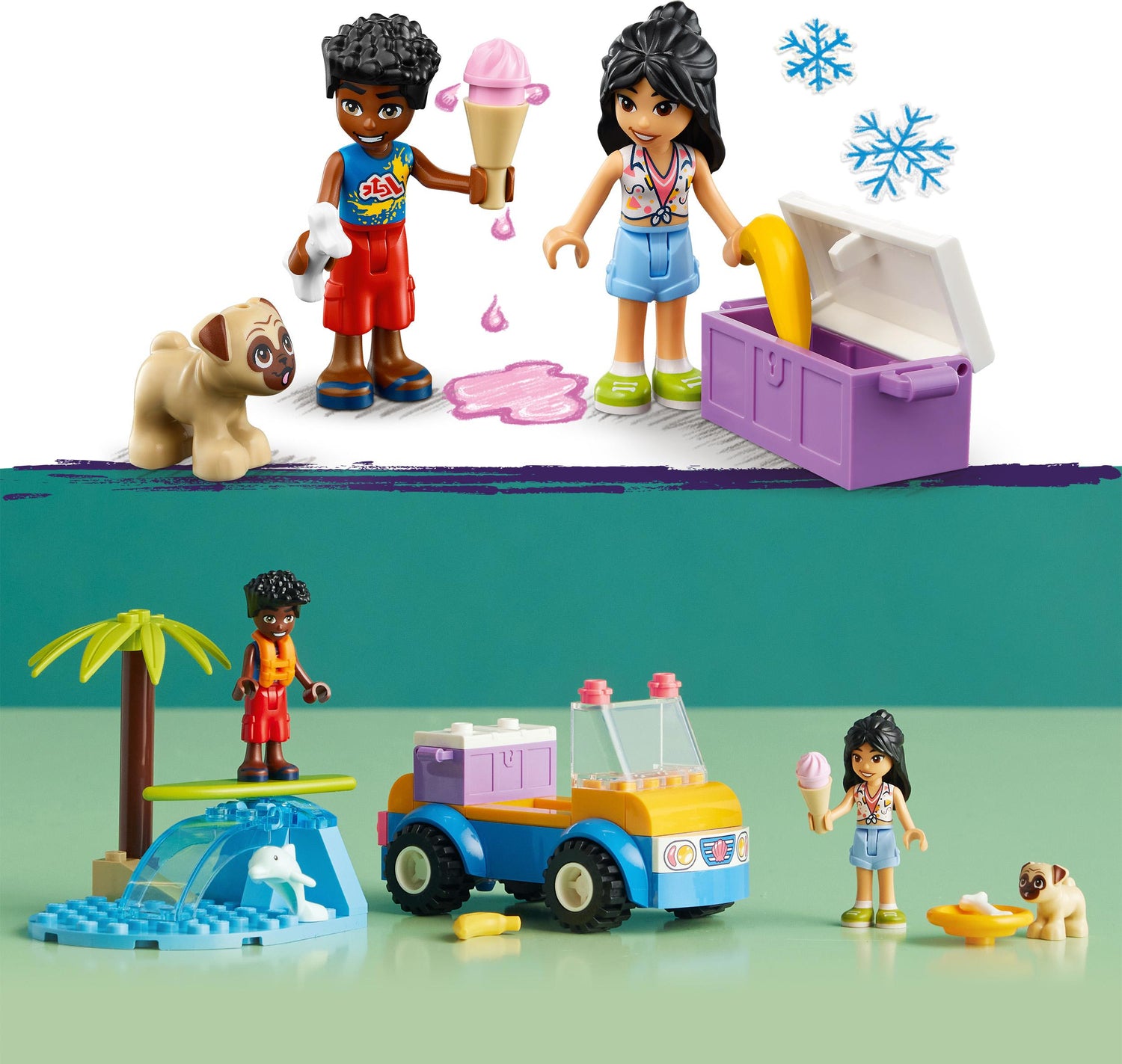 - Includes LEGO Friends characters Liann and Zac mini-dolls with a surf board, a pet pug dog figure with a bone and water bowl plus a dolphin figure