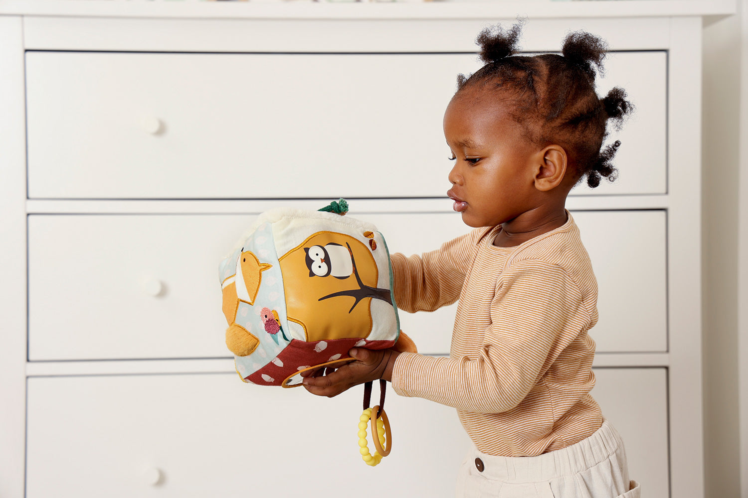 The Activity Cube is designed for playful discovery, serving as a developmental toy with a variety of fabrics that offers different textures and colors. It encourages hand-eye coordination and motor skills, including rattle, crinkly fabrics, and a mirror for discovering reflections. The Activity Cube is not only fun to play with but also aids in the development of fine motor skills.