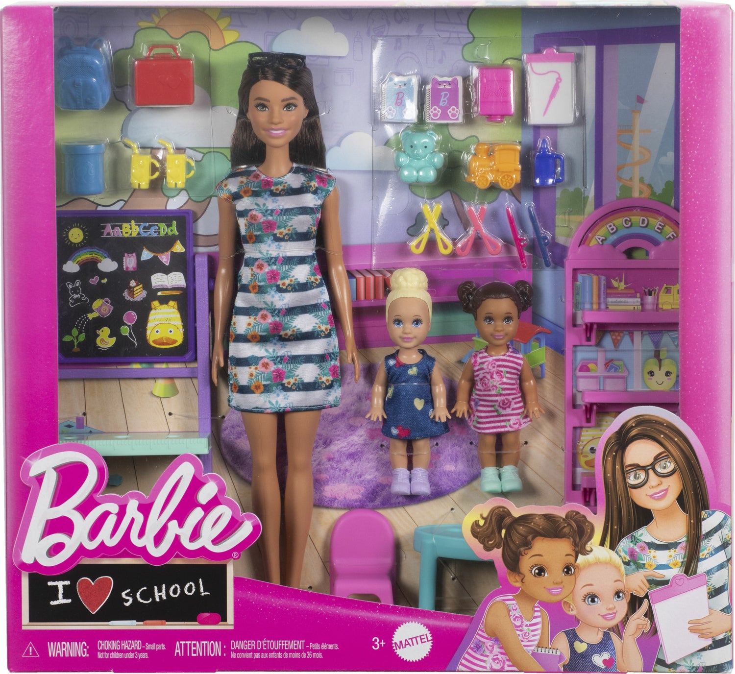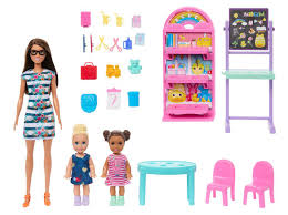 Class is in session with this Barbie® preschool playset that comes with Barbie® teacher doll, two small toddler dolls and more than 15 pieces of furniture and classroom accessories. Kids can lay out a seating area to match any lesson with a table and chairs, an art space with an easel and a shelf unit to store smaller items. With pieces like a backpack, lunchbox, notebooks, art supplies and more, kids can immerse themselves in role-play fun.