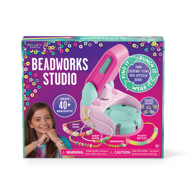 Don’t toss it, transform it! Turn everyday items into fabulous upcycled beads with Craft-tastic Beadworks Studio! Take your used materials like old homework, plastic bottles, and cardboard boxes and transform them effortlessly into trendy beads with the simple-to-use punch. The Beadworks Studio is designed to easily punch and store your beads for threading bracelets in minutes! Use the included beads and charms to add some extra flair to your adorable upcycled bracelets. Comes with the Beadworks Studio punch tool, 40 gold beads, 40 silver beads, 20 clear beads, 5 metal charms, 20 jump rings, 6 yards of elastic, 6 yards of knotting cord, 1 wire threader, and instructions, all in a colorful box that’s perfect for trying out the punch and making your first set of upcycled beads! For ages 8 and up.