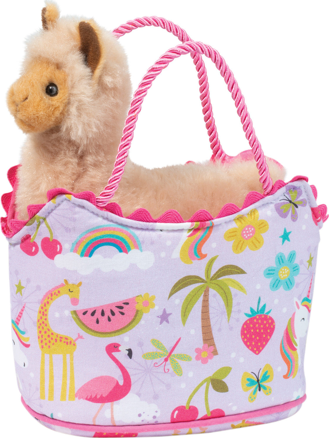 Abounding with warm, summer imagery, our Berrie Surprise Sassy Pet Sak is a sweet addition to any wardrobe! A menagerie of fanciful animals, insects, and assorted fruits decorate the sides of this totebag. Their pastel purple background complements the cotton candy pink piping and rick rack trim. Our purse’s silky twist cord handles feature a satiny shine and provide a comfortable way to carry your most important accessories with you wherever you go. Standing at attention, a plush Llama peers out from inside the bag. Her woolly coat of fur is soft to the touch and her dark eyed expression is sure to win new fans. Bring a splash of brightness to your day with our endearing Berrie Surprise tote!