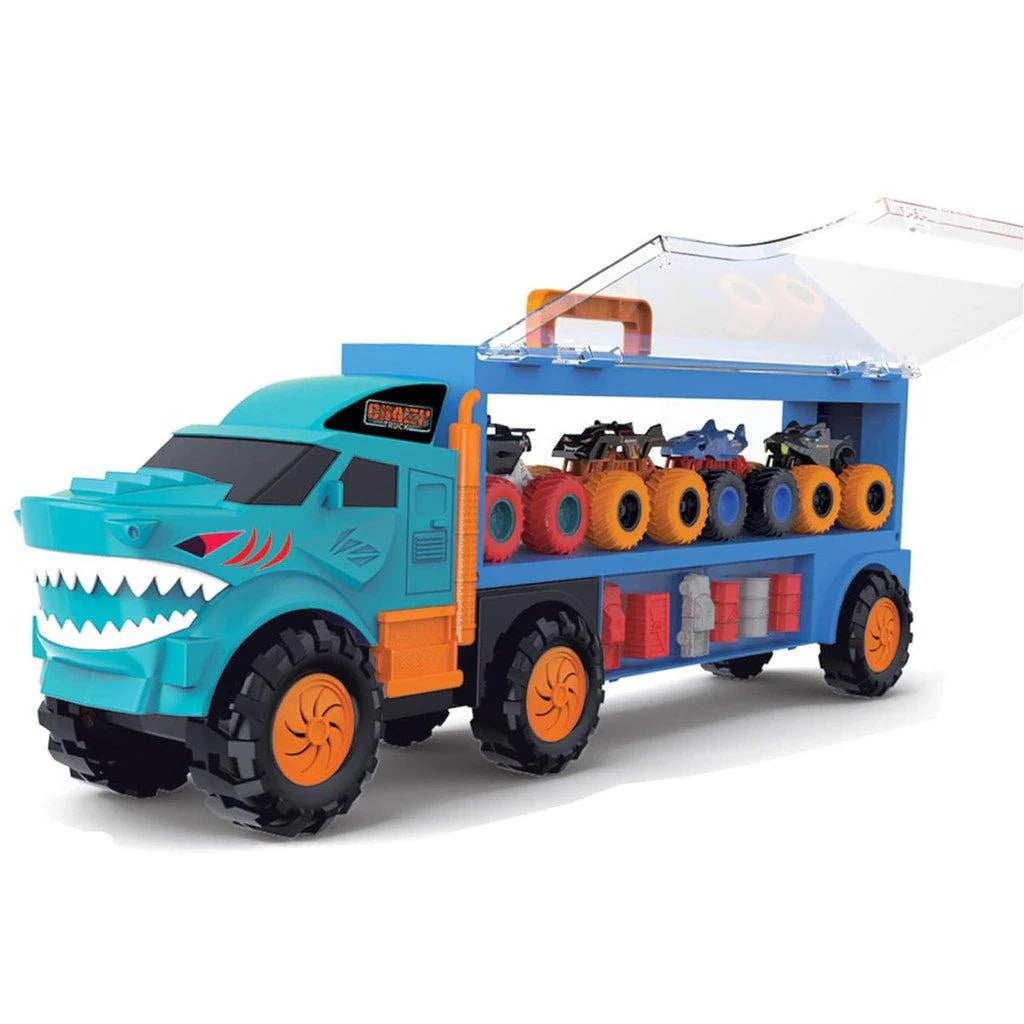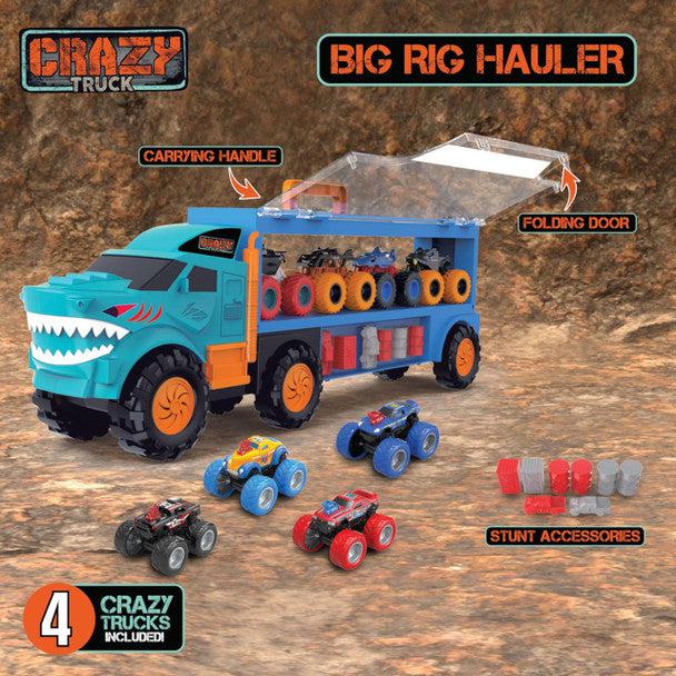 Kids can really immerse themselves in the action with this huge 2-foot-long rig! Included are 4 different crazy monster trucks, ready for a day at the track or arena. The included stunt accessories stow under the truck, ready to head off to the next performance.