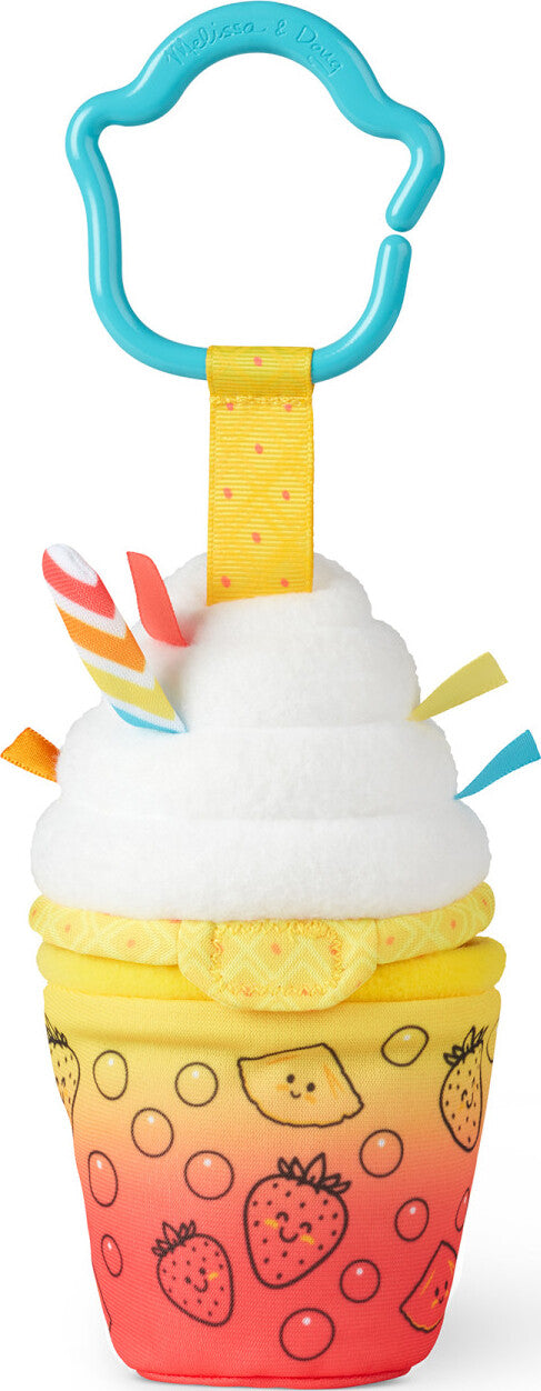 - Includes bright plush cup with attached squishy whipped cream lid with satiny ribbons, bell inside and mirror underneath, textured plastic pineapple and strawberry, removable clip