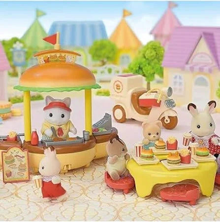 Comes with over 30 accessories including cute hamburgers with cat ear-shaped buns and drinks.The hamburger stand can be set up in two ways―shop mode and transport mode. The hamburger stand can be attached to the delivery bike and driven around.The Latte Cat father, the owner of the hamburger stand, delivers delicious hamburgers to all the villagers. He is wearing a special hamburger shop uniform that is only available with this set.