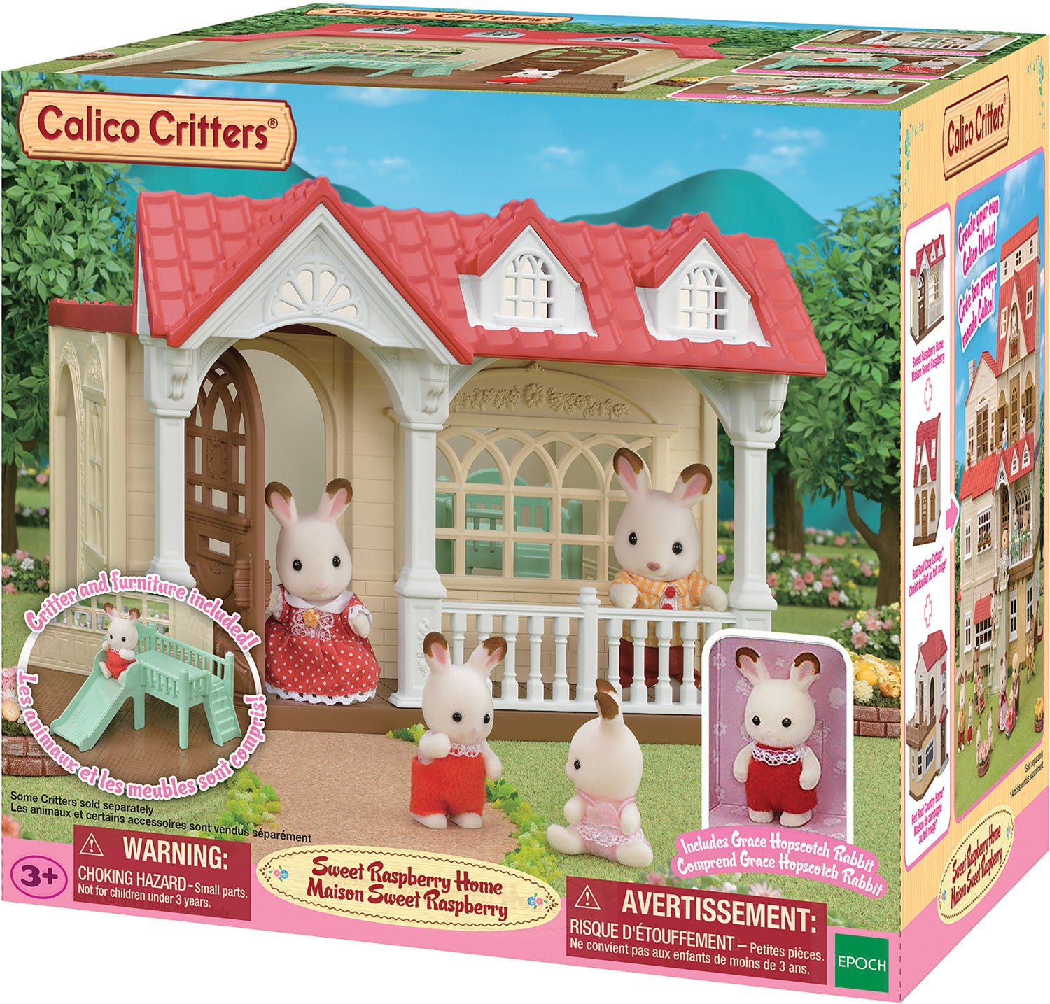 Sweet Raspberry Home is a one-story house with an amazing entrance terrace and red roof. It comes with Hopscotch Rabbit Baby and baby furniture, so you can play with this set right away. Sweet Raspberry Home is a one-story house with an amazing entrance terrace. With its large interior and high ceiling, hands can fit inside for easy play. The set comes with Hopscotch Rabbit Baby and a baby bed with a slide. Combine with Red Roof Cozy Cottage, Red Roof Country Home, or Red Roof Tower Home (sold separately) to create a huge house. Or play with other figures and furniture for even more fun (sold separately).