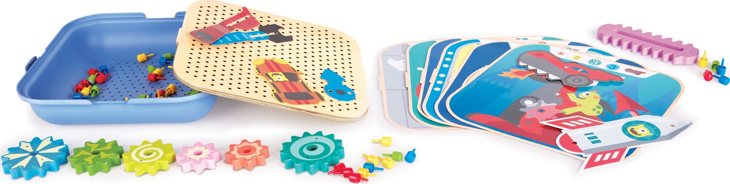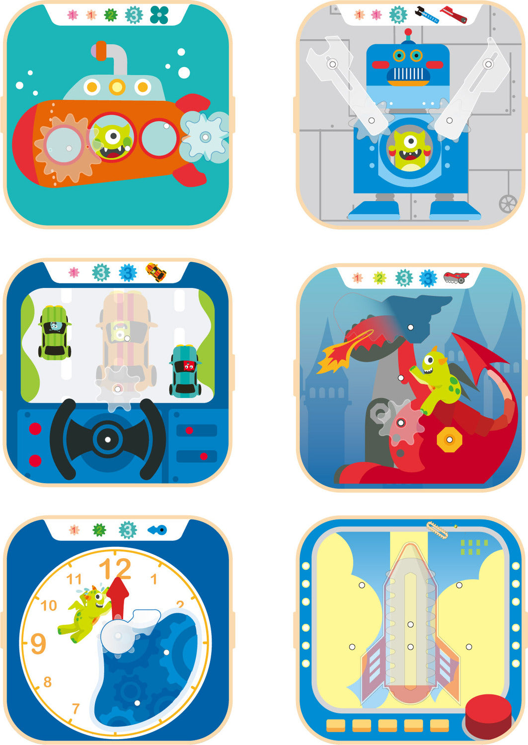 Explore the world of spinning gears,cogs and engineering with this wonderful playset! Place the pins,cogs and cardboard decorations on one of the six backgrounds,then spin the gears to see them come to life!