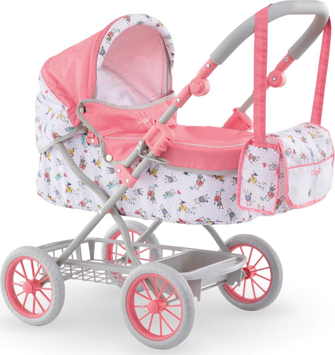 Little ones will love taking their favorite 14" - 20" baby doll for a stroll in style in this smartly styled carriage. Its handle height is adjustable from 14" to 29.5" to accommodate children as they grow. It has an adjustable hood, a storage basket for baby's things, a removable bassinet cover and comes complete with a matching nursery bag. When playtime is over, the carriage folds easily for space-efficient storage. It's part of the Mon Grand Poupon Corolle Collection of dolls, fashions and accessories to help make-believe moms and dads take care of their baby doll the way their parents take care of them. Ages 3 years and up. 27.5"L x 27.5"H x 15.75"W