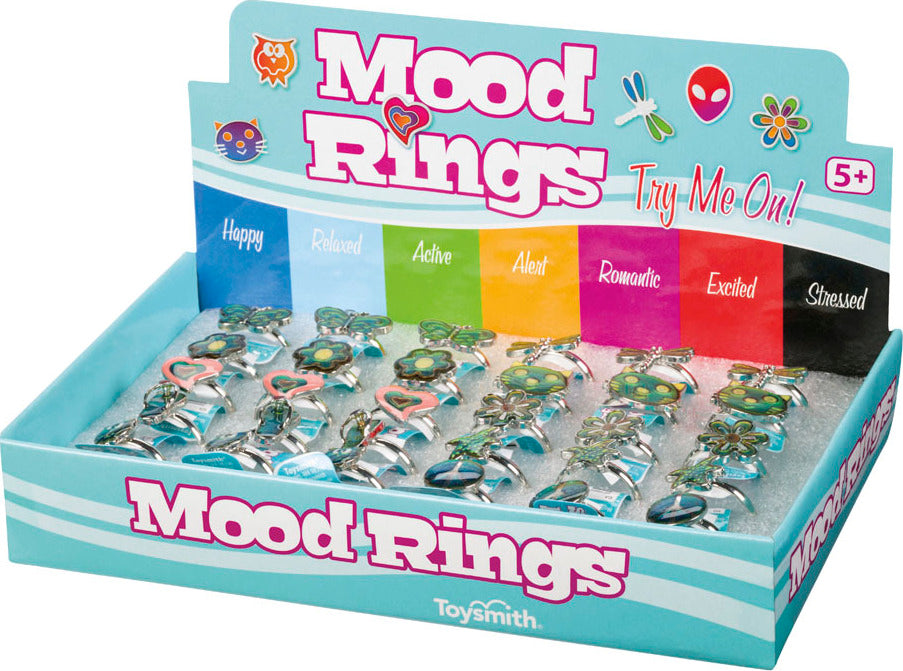 A best-selling jewelry item for kids, the Toysmith Cutie Mood Rings are fun to wear everywhere. Each ring features an adjustable band so it can be worn on any finger. Rings come in sets of 30 with an equal mix of each of the 10 ring designs. Come with 10 assorted 1 x 0.5-inch ring styles with adjustable bands for an easy, personalized fit. Styles include flower (2 styles), butterfly, dragonfly, mushroom, flip-flop, heart, kitty, alien, and starfish. Available with colorful 4.01 x 6.41-inch display case with illustrations for 5 of the assorted ring shapes.