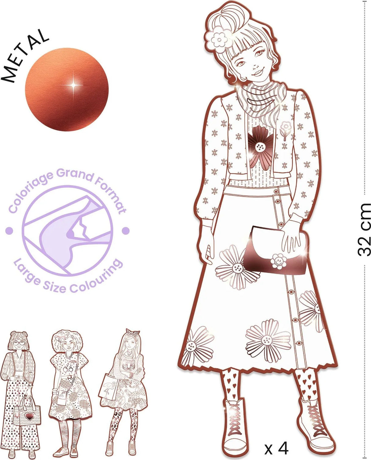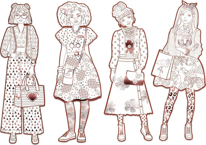 A parade of girls wearing colorful outfits for you to color in however you'd like! Four large outlines offer outfits covered in patterns and adorned with metallic areas to make the models look even better!