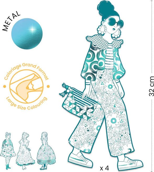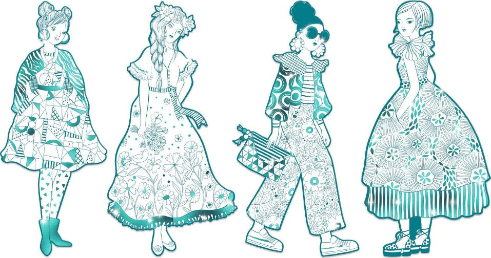 A parade of girls wearing colorful outfits for you to color in however you'd like! Four large outlines offer outfits covered in patterns and adorned with metallic areas to make the models look even better!