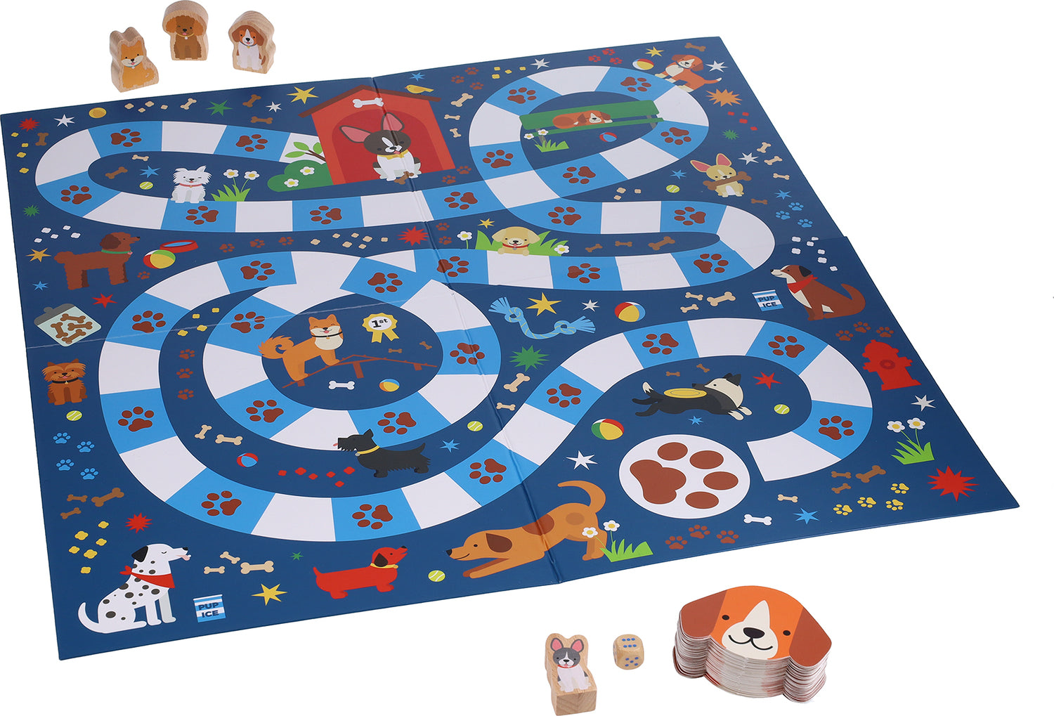 FOR 2-4 PLAYERS – This children's board game is ideal for 2-4 players, ages 4 and up. Includes a game board, 4 wooden dog character pieces, 1 wooden die, and 50 action cards in English, French and Spanish.