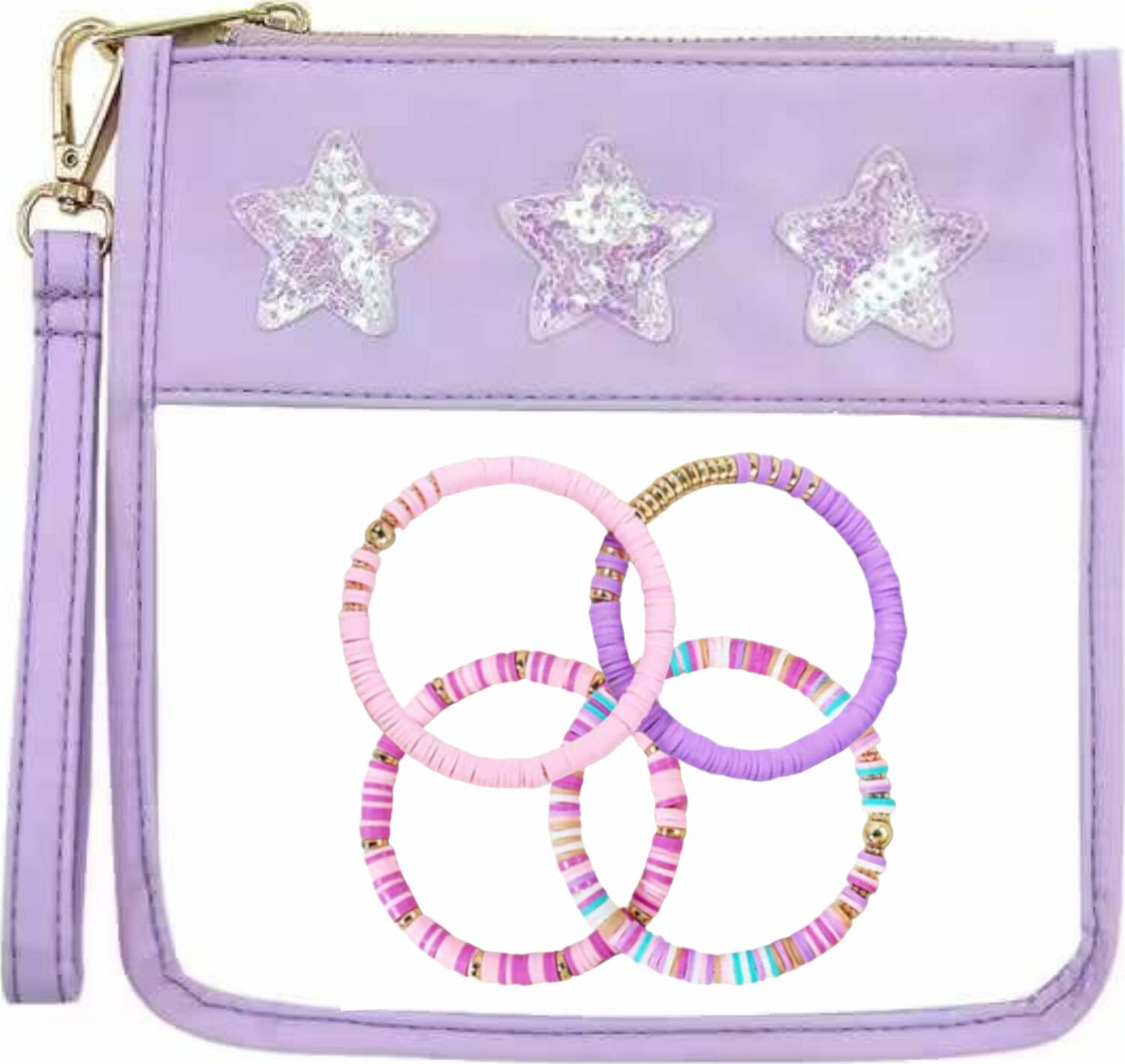 This adorable clear, lavender bag has sequin stars and a gold zipper wristlet. It comes with four friendship bracelets insides - perfect for sharing, swapping or yourself!