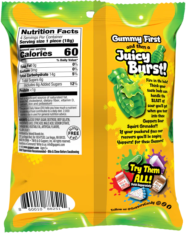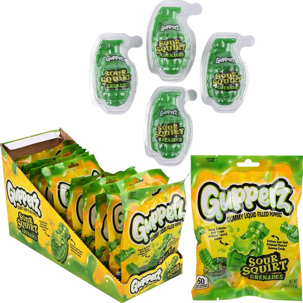 Indulge in a burst of sour sweetness with Gupperz Sour Squirt Grenade. Our gummy treat is filled with juicy, tangy apple flavor that will leave your taste buds craving for more. Experience the perfect balance of sour and sweet with every bite. Try it now!