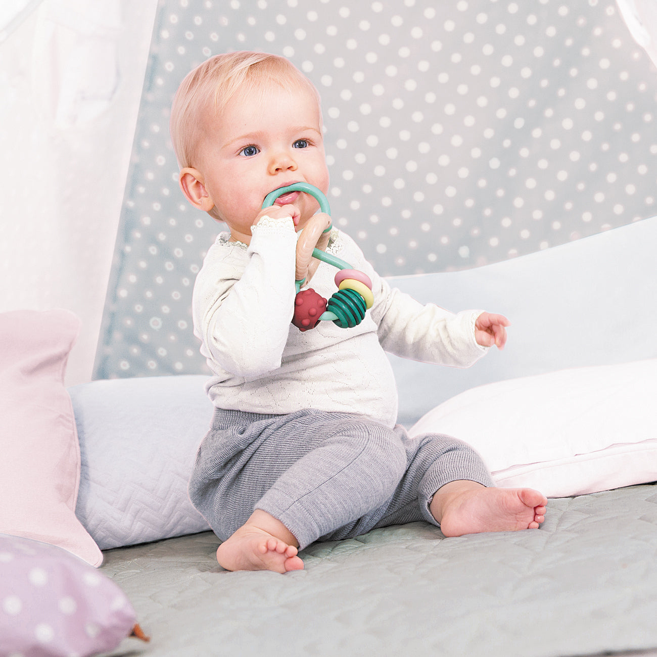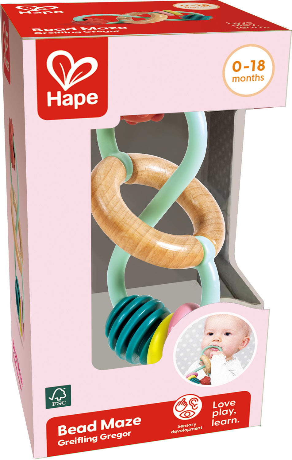 This great infinity symbol bead maze is a fantastic way to help your little ones develop their early life skills as they play. Slide the differently-textured beads and discs along the infinity symbol bead maze or simply explore the soft, smooth, textures for a wonderful sensory experience! Features a ring of smooth wood, gently textured infinity symbol track, two rubbery, embossed beads and two discs. Great for encouraging tactile development and hand-eye coordination as well as developing fine motor skills.
