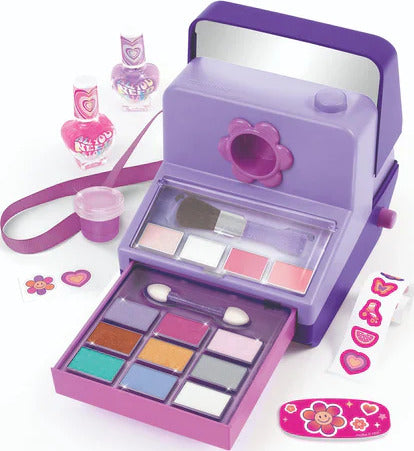 Let’s see what makeup looks develop when you use the Instant Glam Cosmetic Case! This camera-shaped case comes complete with a variety of makeup for head-to-toe glam, a pop-up mirror, nail file, and uber cute stickers to decorate the case.