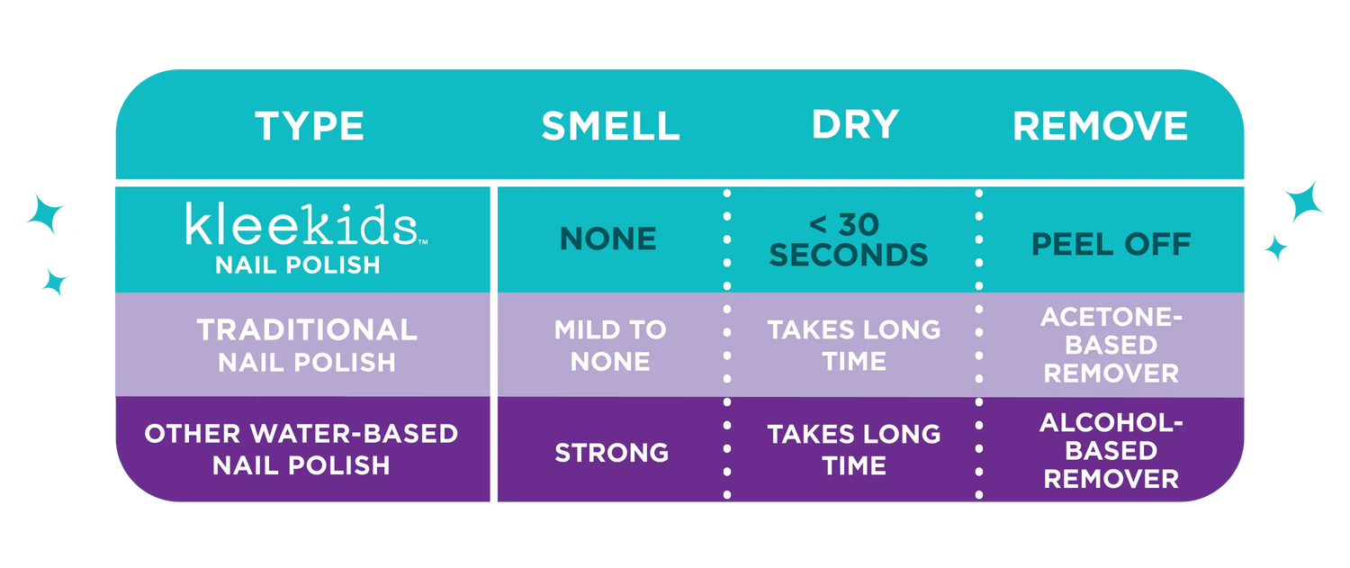 Most nail polish smells toxic because of the fumes released by alcohol, solvents and other scary chemicals. Klee Kids Water-Based Nail Polish contains none of those scary chemcials. Best of all, the polish can be peeled off without nail polish remover after use.