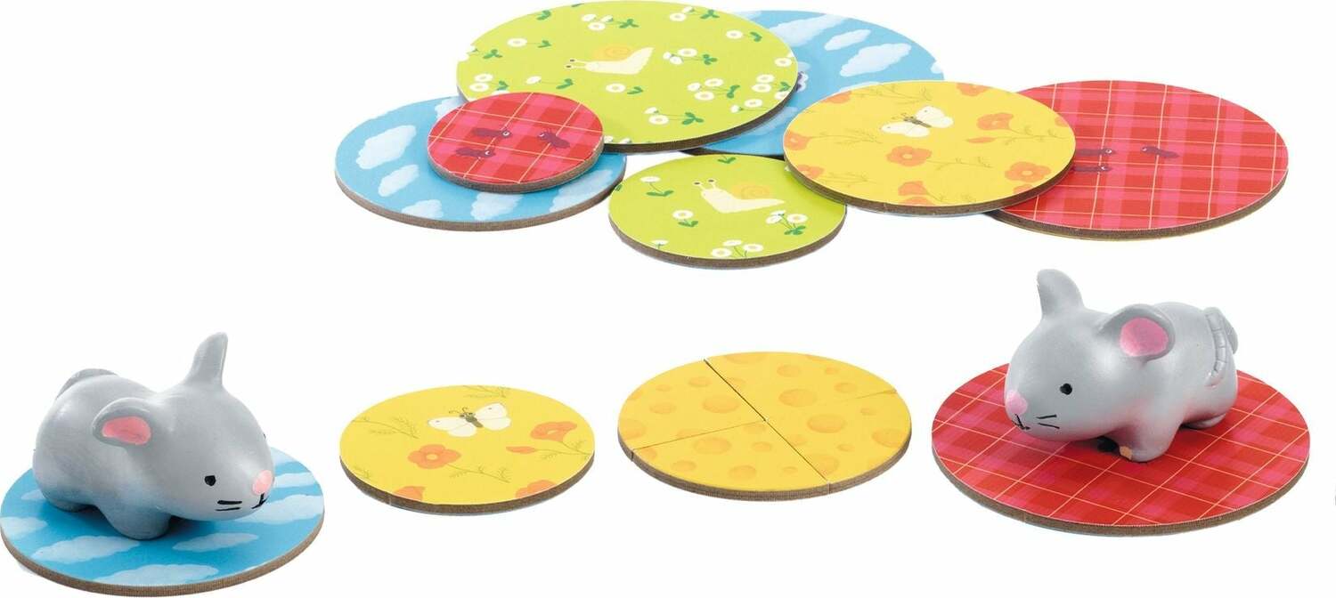 Contents: 24 tiles and 2 wedges (divided into 4) made of card, 2 vinyl figurines and 1 set of game rules in 10 languages.